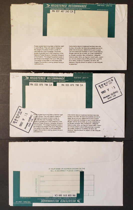 Canada #1155ii, 1156i, 1161-ii, 1181-1182 $1-$2 High Value Definitives, 1988-1992 Mammal and Architecture Issue, Combination Use on Three $3.27 Registered Domestic Covers