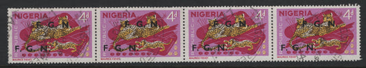 Nigeria SG#177avar 4d Leopards, 1966-1973 Wildlife Definitives, A Fine Used Strip Of 4 On MF/DF Paper, Pink Background Under UV, FGN Overprint, With Clear Lagos April 1969 Registry Cancel, From The Usage By Lagos Tax Services Office, Rare