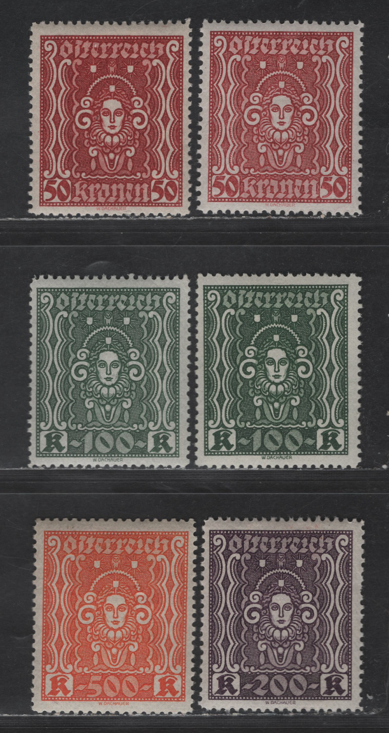 Austria SC#290f, 290j, 291e, 291F, 292c, 293 50k - 500k Brown Red - Deep Orange Symbols of Art & Science, 1922-1924 Art & Science Issue, 6 F/VFOG Singles, Wet Printings, 25x29.5mm