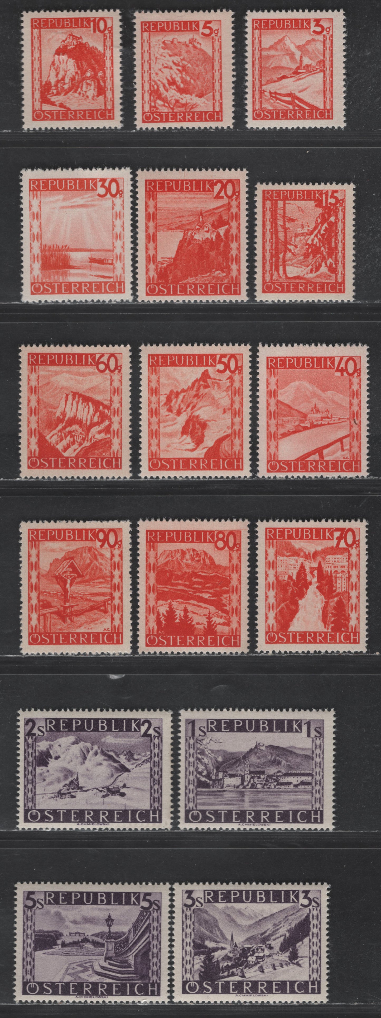 Lot 175 Austria SC#500-515 3g - 5s Bright Red - Dark Violet Lermos - Durnstein, Lower Austria, 1947-1948 Scenic Types Issue, 16 VFNH Singles, Perf 13.5x14