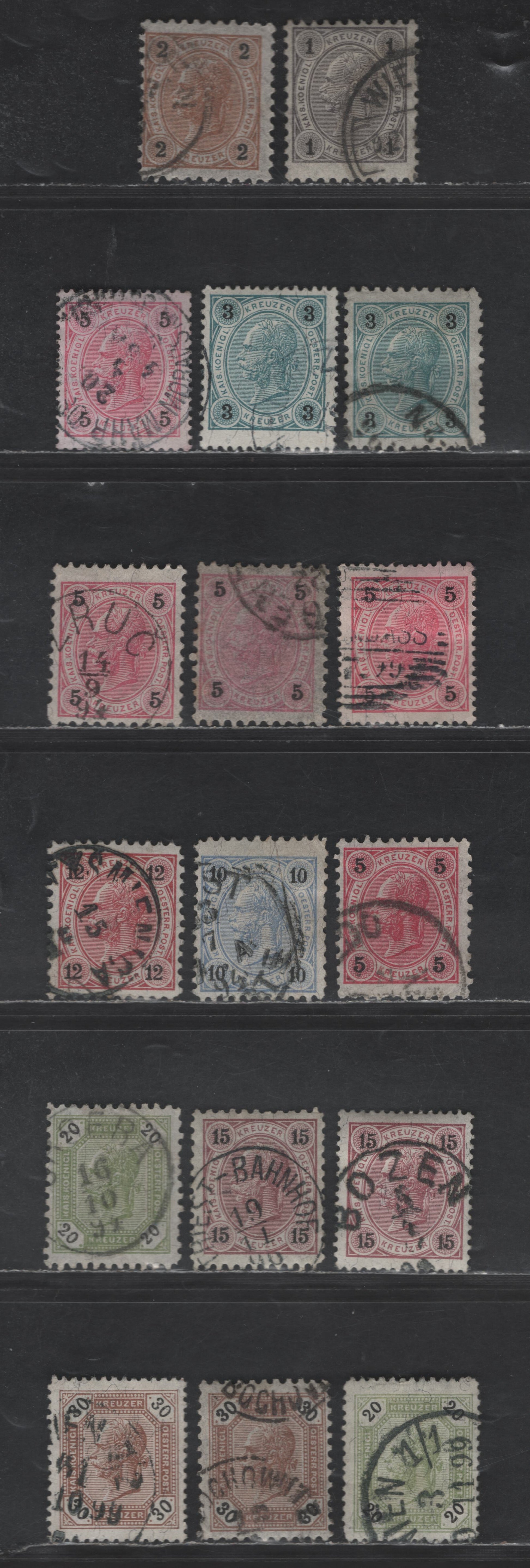 Austria SC#51/69 1k - 50k Dark Gray - Brown Emperor Franz Josef, 1890-1896 Emperor Franz Josef Issues, 17 Fine Used Singles, Various Perfs & Paper Types, Black Numerals & Kreuzer Currency