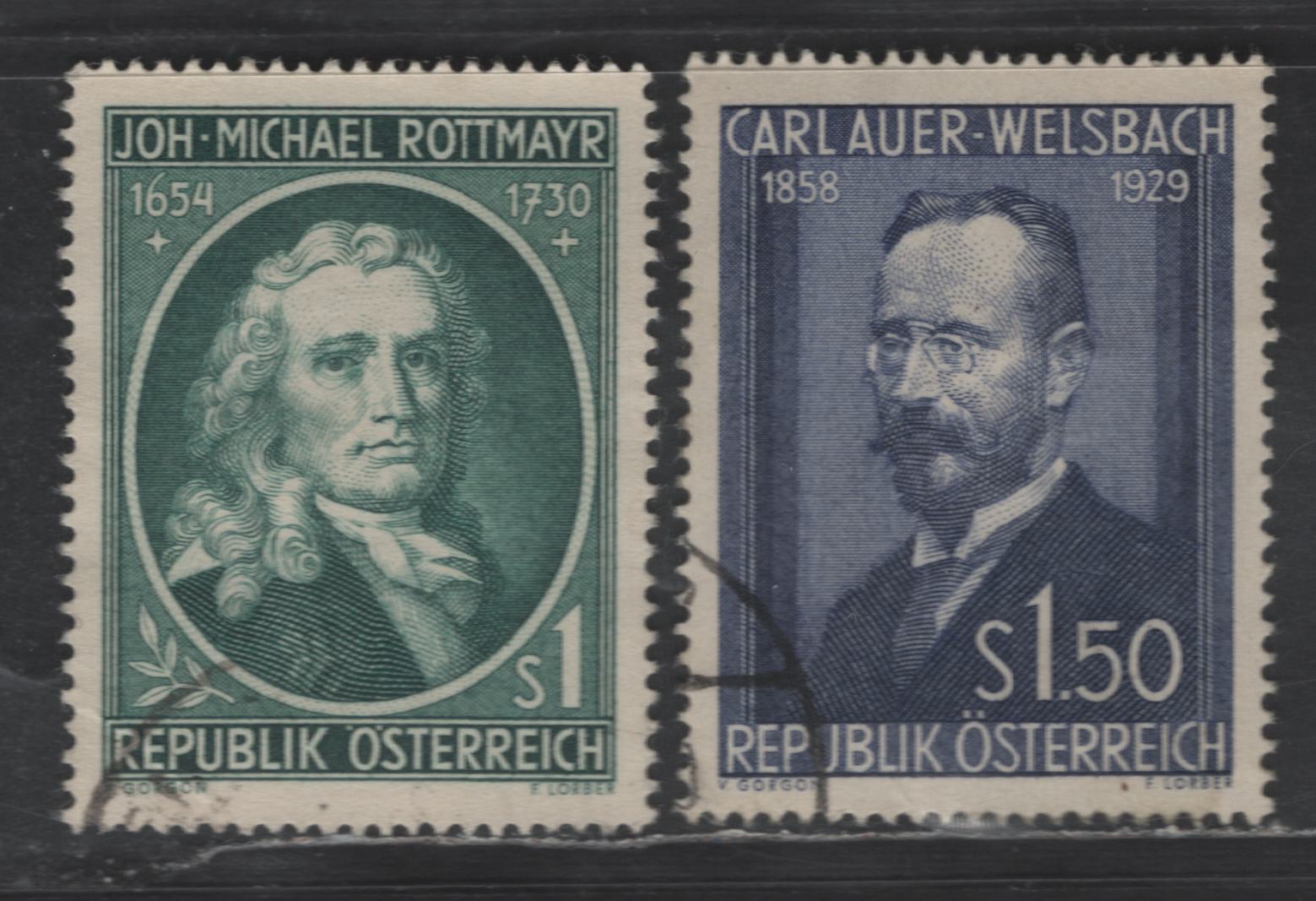 Austria SC#594-595 1s - 1.50s Dark Blue Green - Violet Blue Johann Michael Rottmayr von Rosenbrunn - Carl Auer von Welsbach, 1954 Johann Michael Rottmayr von Rosenbrunn - Carl Auer von Welsbach Issues, 2 Very Fine Used Singles, Perf 14x13.5