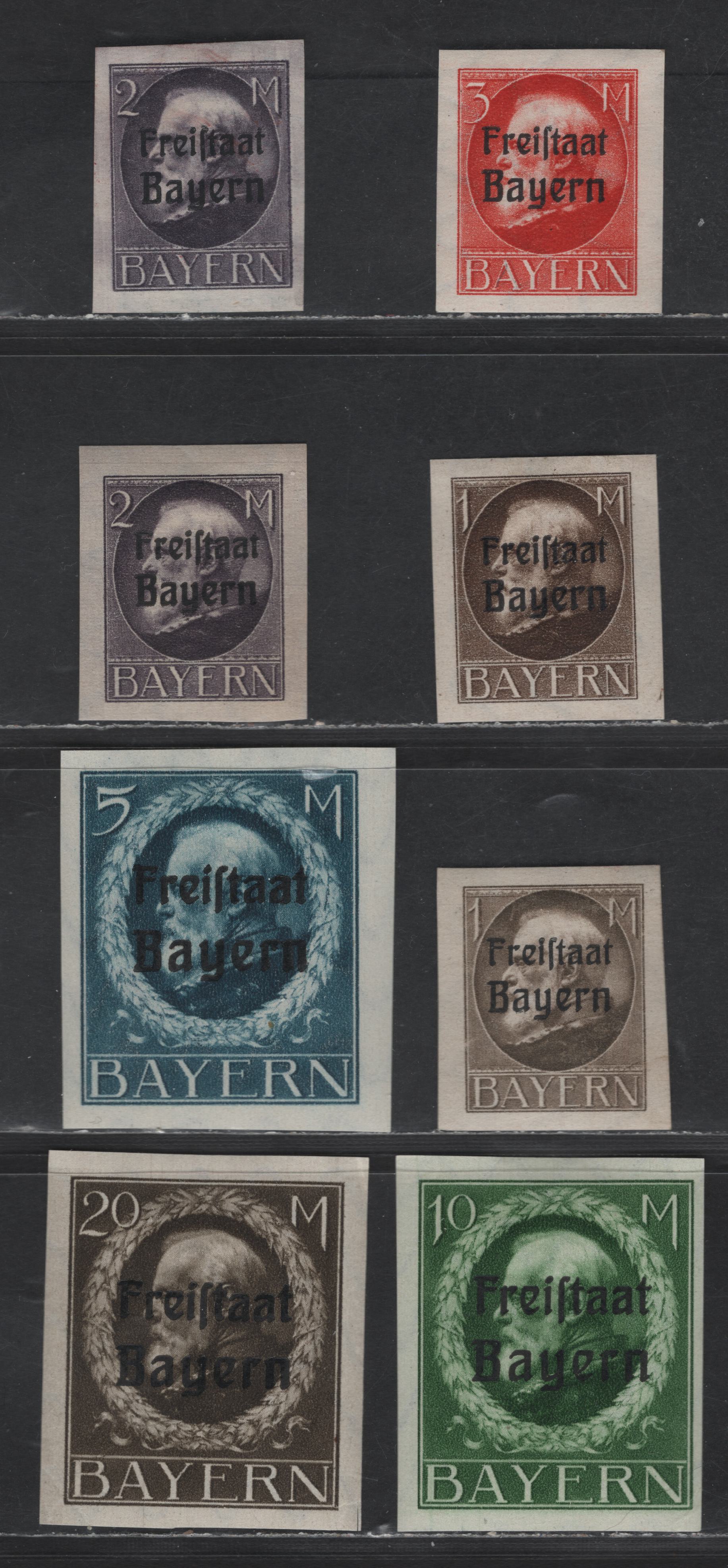 Lot 169 Bavaria #225-230 1m Deep Dive Brown - 20m Deep Grey Brown, 1919-1920 Free State Overprints On High Values Of the Ludwig III Issue, 8 VFOG Singles Wartime Printings With Extra Shades Of 1m & 2m