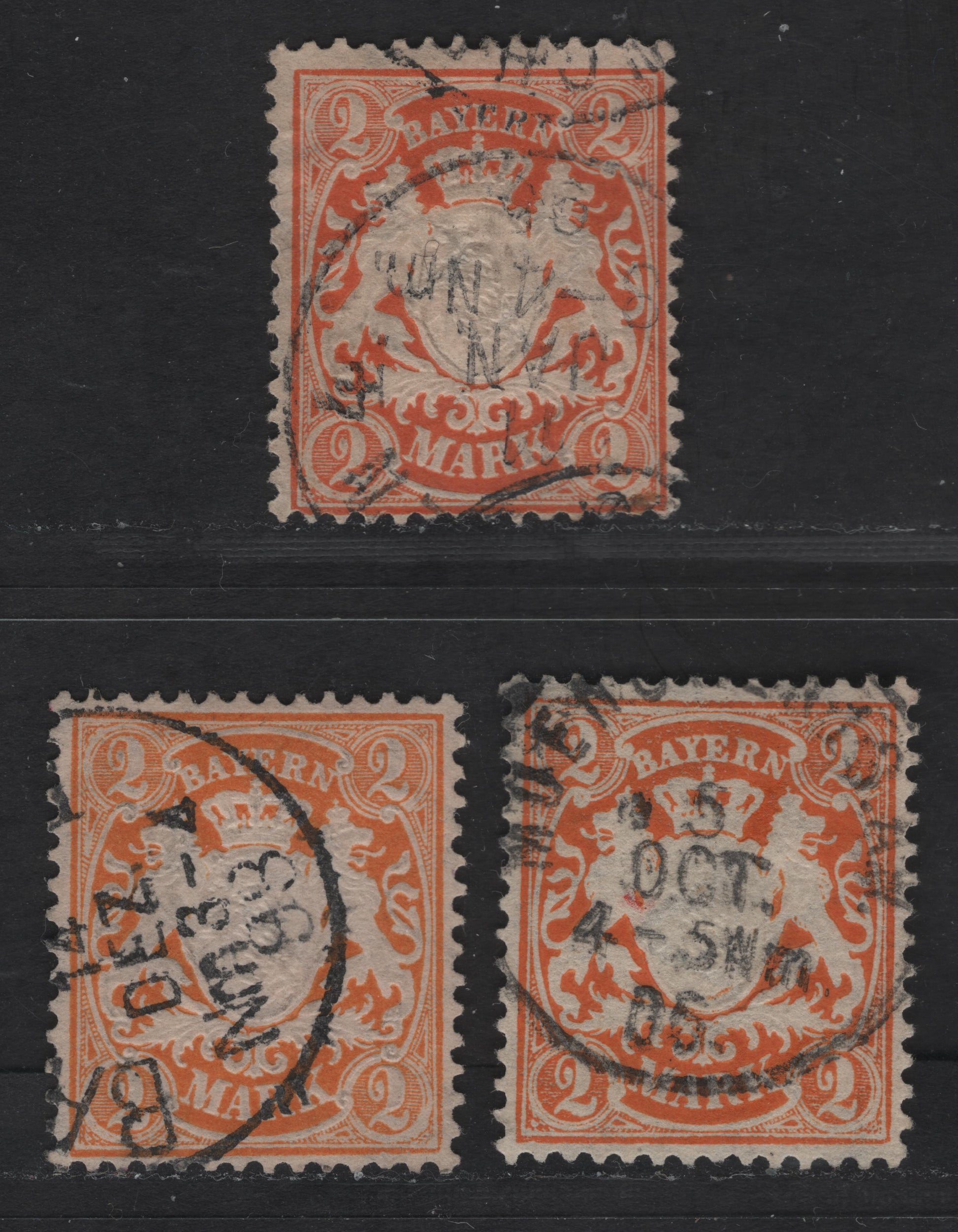 Lot 168 Bavaria #55 2m, 1881-1911 Embossed Arms Issue With Perf 11 1/2, Wmk Vert. Wavy Lines, 3 F & VF Used Singles Reddish Orange, Bright Orange & Yellowish Orange On White Paper