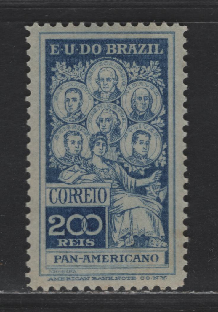 Brazil SC#191 200r Deep Blue 1909 Bonifacio, Bolivar, Hidalgo, O'Higgins & San Martin Issue, A VFOG Single, Click on Listing to See ALL Pictures, 2022 Scott Classic Cat. $12