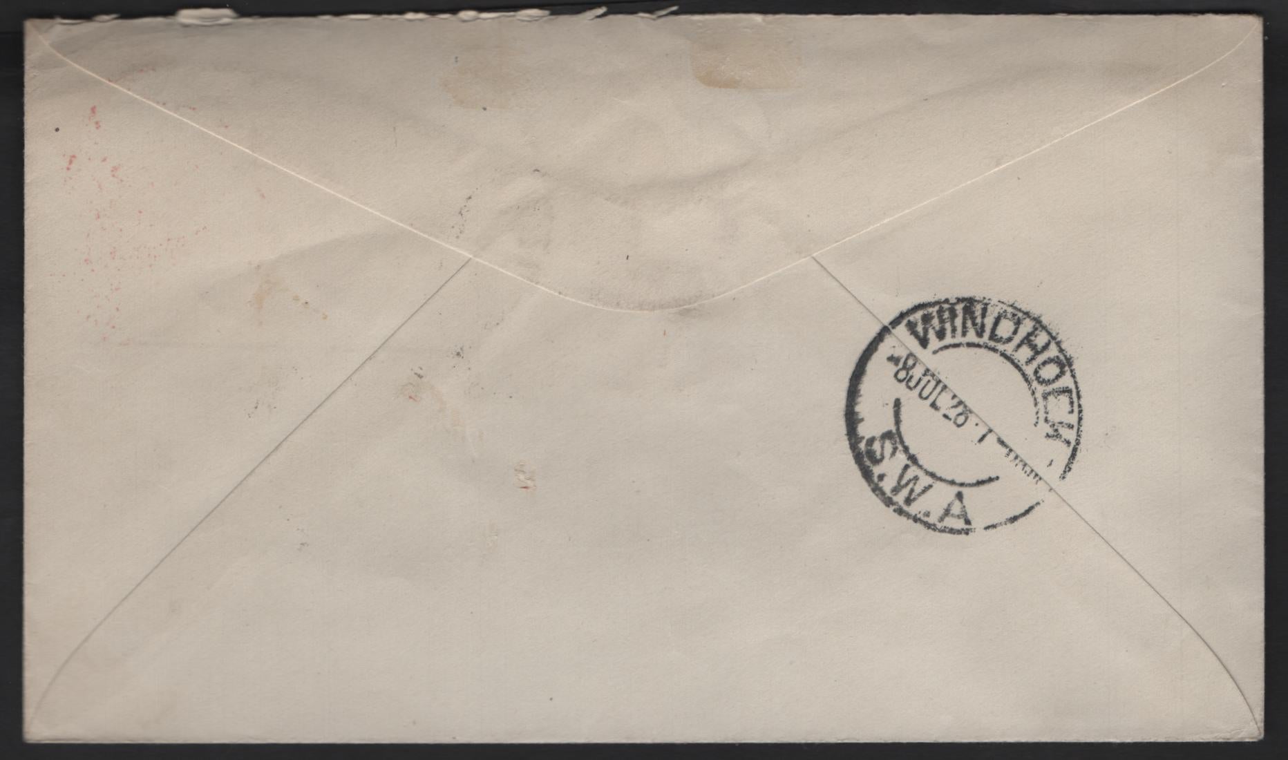The pair is tied to the cover by a Jult 18 1928 Windhoek Cancel. Gibbons catalogue value using the footnoted multiplier.