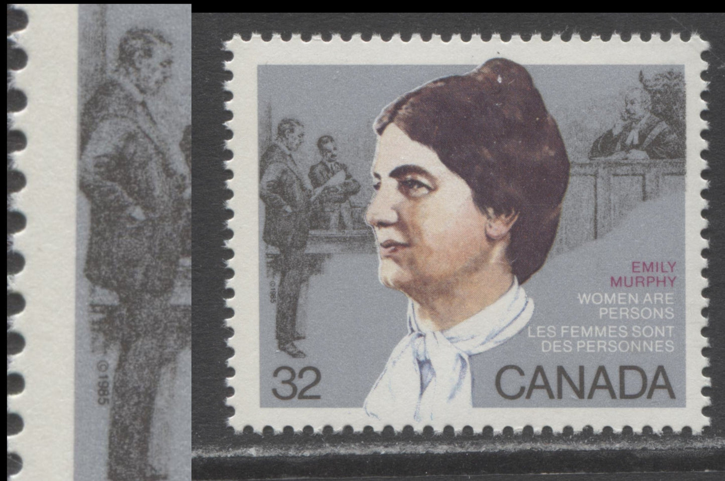 A VFNH single of the 32c multicoloured Emily Murphy from the 1985 Canadian Feminists Issue leftward shift of grey, DF2/DF1 Harrison paper. Normally, the Lawyer's elbow is flush with the left frameline, but on this example there is about 1/4 mm space between the elbow and the frameline, and this is due to the grey colour shifting 1/4 mm to the left. If you look at the judge's bench at upper right, you can just make out some of the dark brown colour protruding past the grey. This normally would not be visible, and would be covered by the grey. 1985 marks the year in which the Harrison paper becomes primarily dull under UV, whereas in 1984 it was primarily LF (at least on the face). The normal appearance of this paper is DF on the front and usually some variation of DF on the back. Variations that are LF on either the front or back are much less common at this point, and definitely worthy of separate mention.