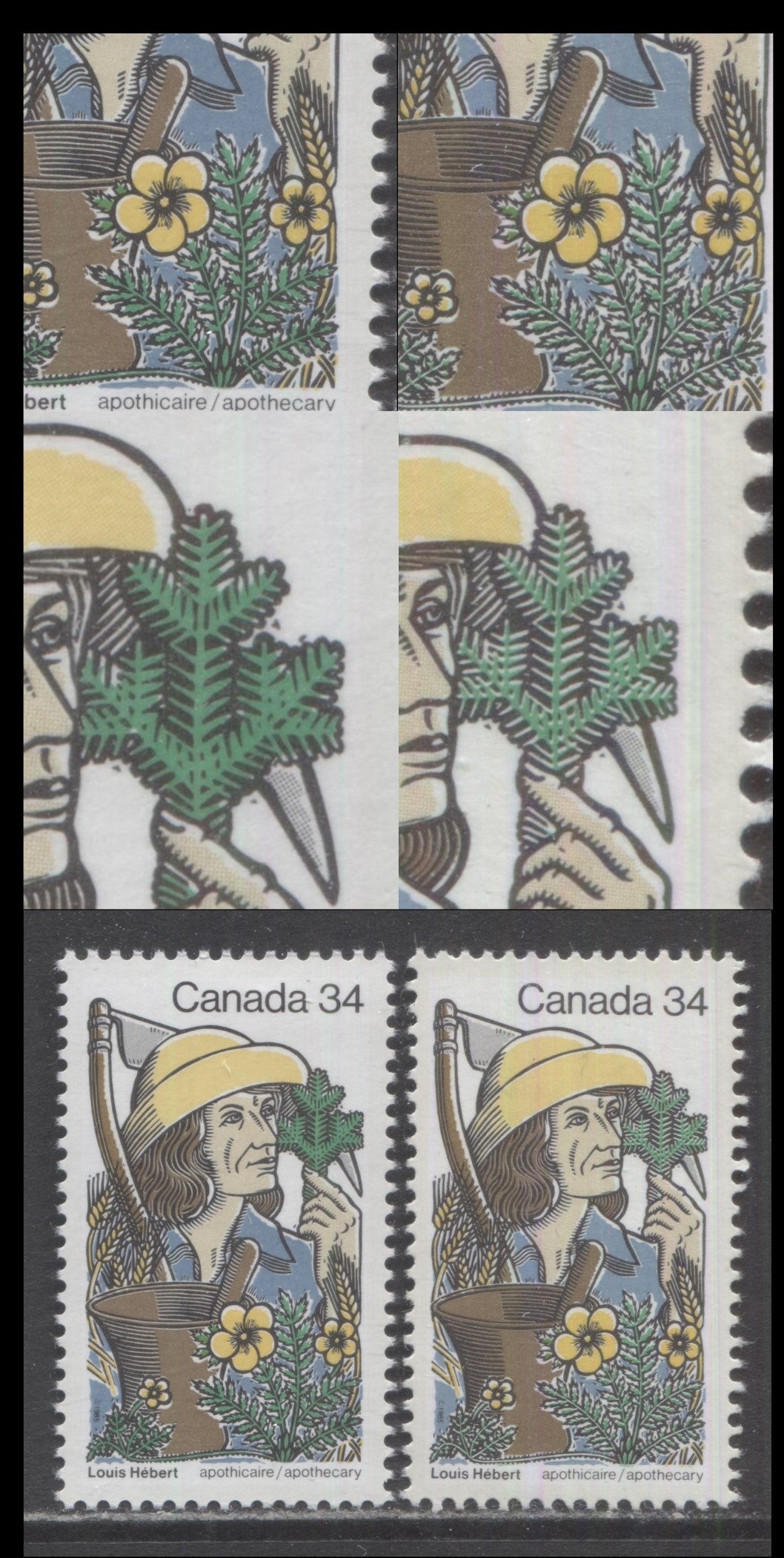 2 VFNH singles of the 34c multicoloured Louis Hebert & Apothecary Objects from the 1985 Louis Hebert Issue variegated green plants variety, MF/MF Rolland paper. The green plant sprig is normally solid green throughout. On the variety the green does not fill all of the space allocated to it, and this is NOT due to a shift of the green. The result is considerable white patches in the green, giving the plant a variegated appearance. This is the very first issue to appear on the new Rolland paper. The fluorescence levels on this paper vary very widely, but on this stamp they seem to cluster around the MF-HF range, with the readings on the front and back being more or less the same. It is only used on three issues in 1985, but becomes more prevalent in 1986, and is the default paper used in 1987's issues. By then, we see the full range of fluorescent reactions on the various issues that utilize it.