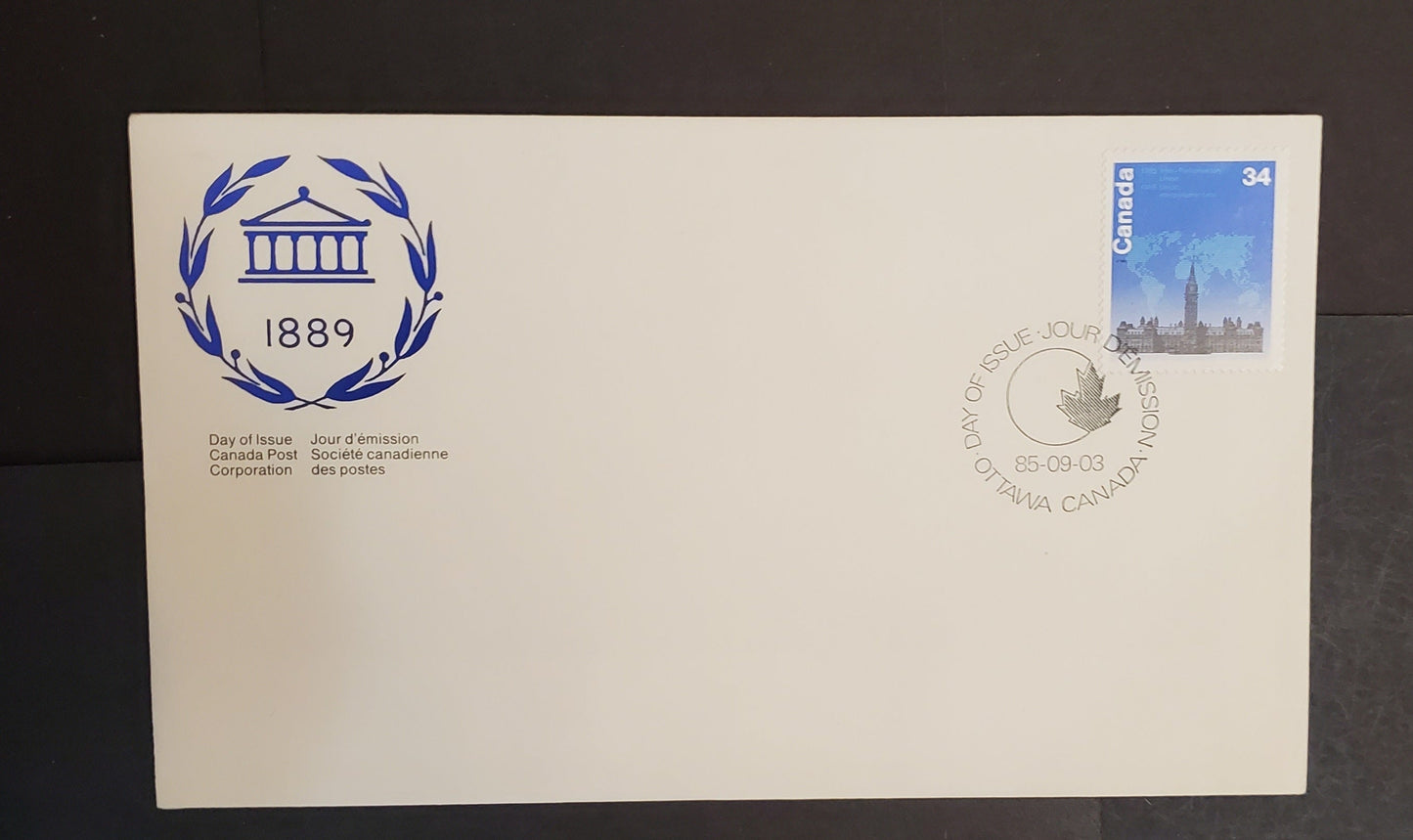 A VF canada post official FDC of the 8c multicoloured Parliament Buildings & World Map from the 1972 Inter-Parliamentary Union CoNFerence Issue DF cream envelope, stamp on scarcer HF/DF Rolland paper. The DF envelopes appear to be the standard ones for these issues. The fluorescence of the envelopes is an important characteristic that has been ignored by all the catalogues. Why does it matter? Because the envelope is an integral component of the FDC in the same way that a cover would be to a complete booklet, or the cardboard insert would be to a pack of plate blocks. The expectation, and general observation would be that Canada Post would utilize one type of envelope for a particular issue, so that if a different one from the standard type is found, then there is a good chance that it will be scarce, and is therefore, in our opinion collectible.