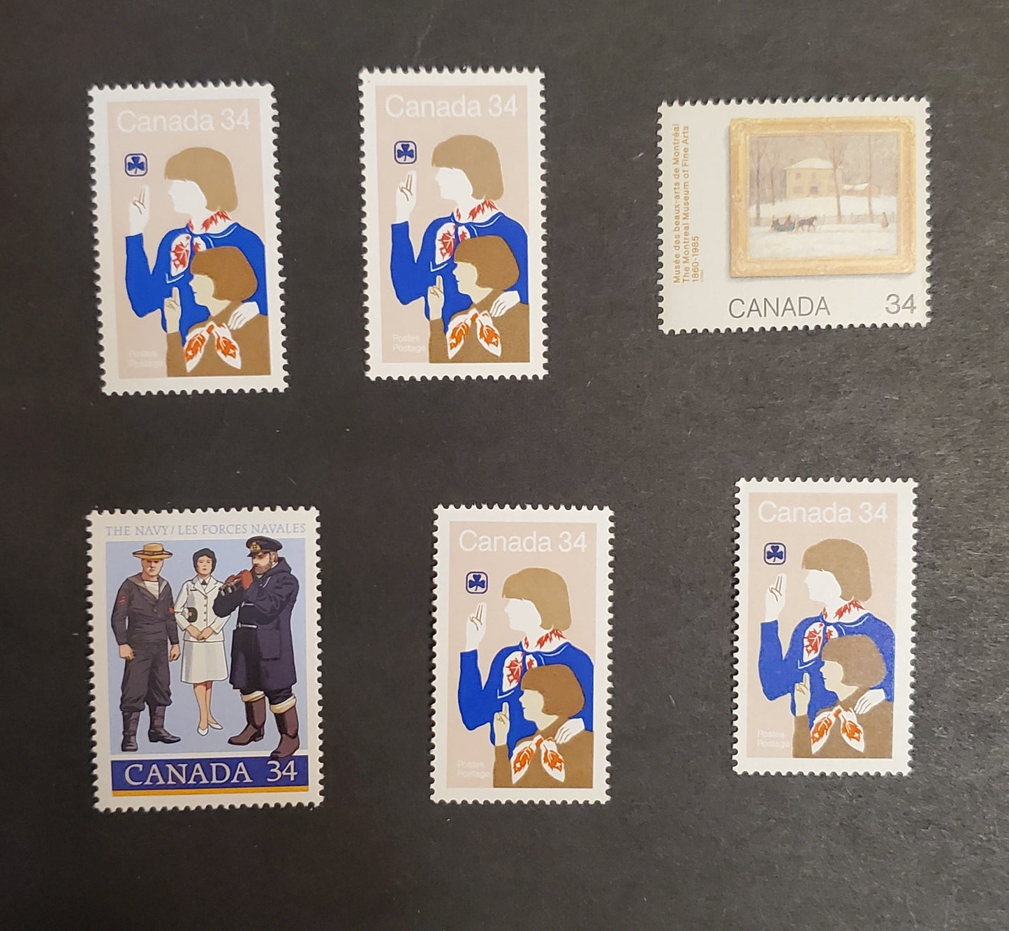 Canada #1062, 1075-1076 34c Multicoloured Girl Guides, Naval Personnel & The Old Holton House, 1985 Girl Guides - Montreal Museum of Fine Arts Issues, 6 VFNH Singles LF/DF1, DF2/DF1, DF1/DF2, DF2/DF2, NF/DF and NF/NF Harrison Papers