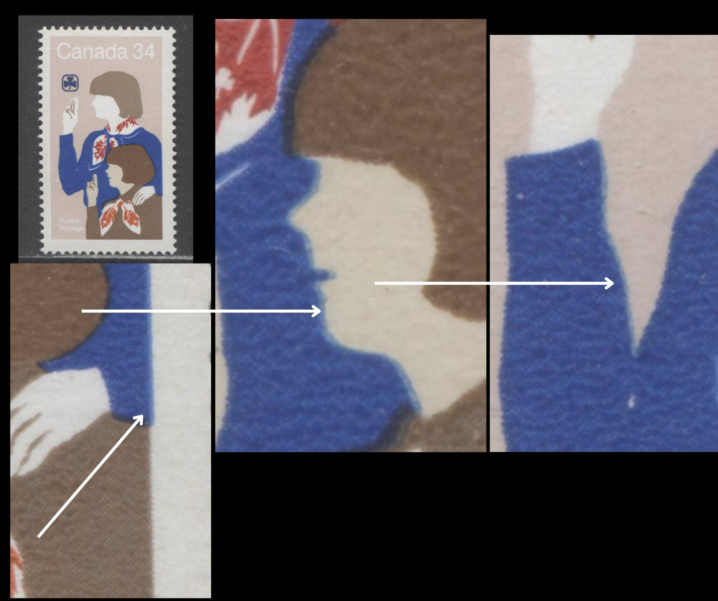 A VFNH single of the 34c multicoloured Girl Guides from the 1985 Girl Guides Issue rightward shift of royal blue, LF/DF Harrison paper. This shift causes fine blue outlines to appear on the edges of the older guide's sweater, and on the younger guide's face and hand. Sections of the white accent on the sweater are also filled in with blue, whwereas this would normally be white. 1985 marks the year in which the Harrison paper becomes primarily dull under UV, whereas in 1984 it was primarily LF (at least on the face). The normal appearance of this paper is DF on the front and usually some variation of DF on the back. Variations that are LF on either the front or back are much less common at this point, and definitely worthy of separate mention.