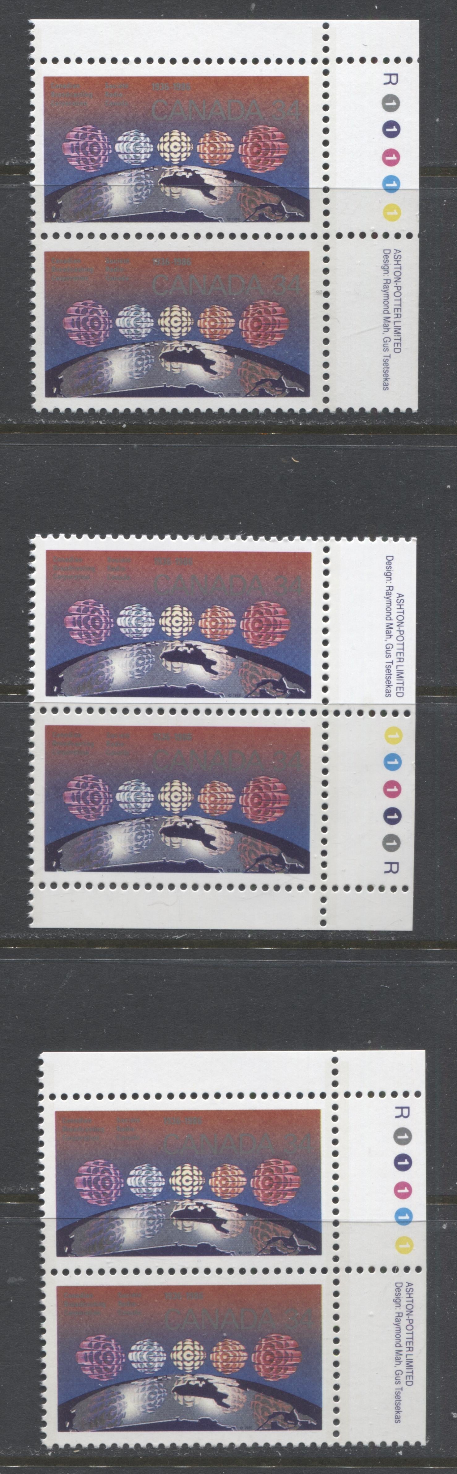 Canada #1103-1103i 34c Multicoloured CBC Logo Over Canada, 1986 50th Anniversary of the CBC Issue, 3 VFNH Inscription Pairs NF/NF, F/HF8 and F/HF7 Rolland papers