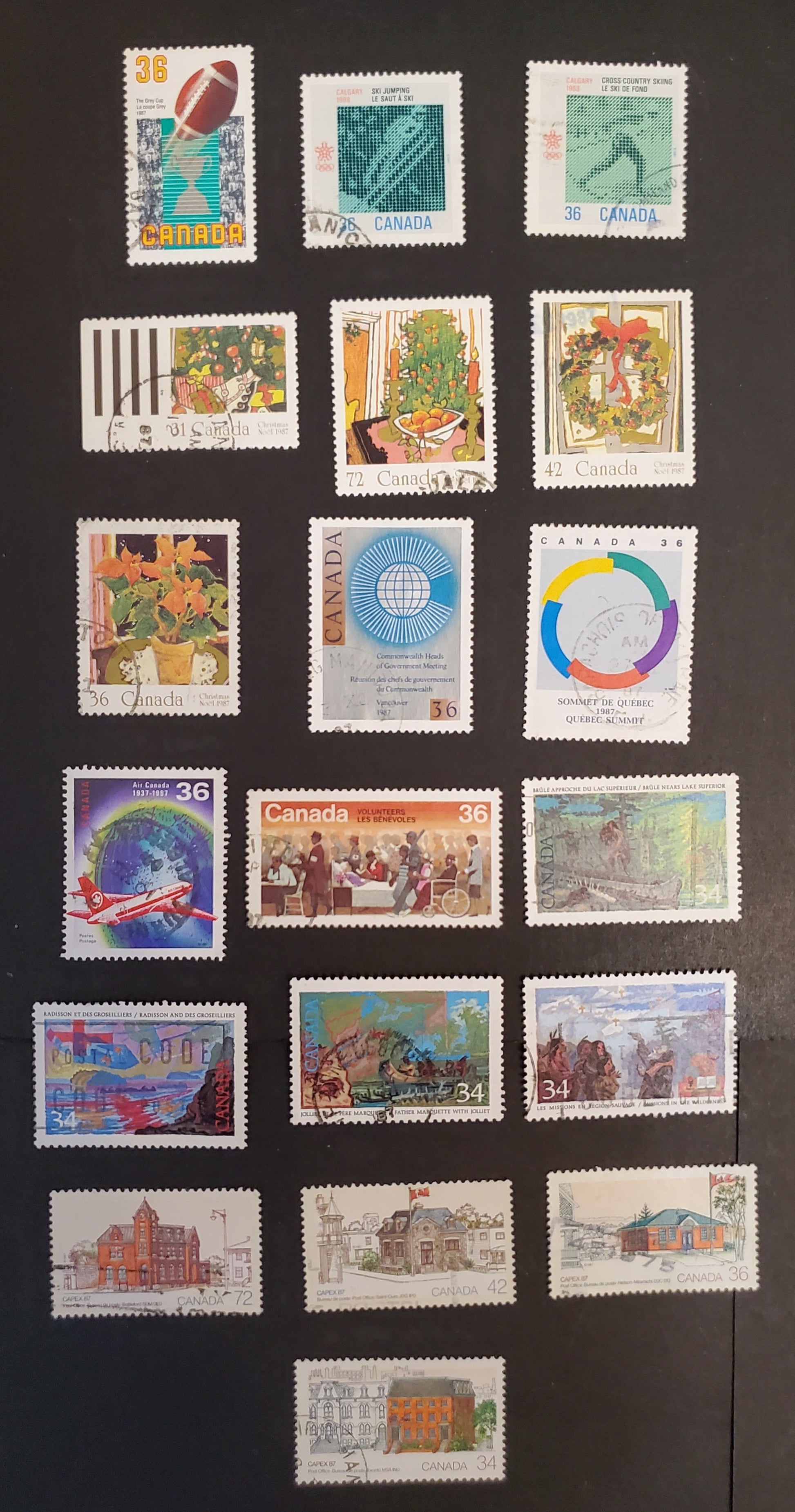 19 VF used singles of the 31c-72c multicoloured various subjects from the 1987 CAPEX '87 - Grey Cup with mostly lighter, in-period cancels.