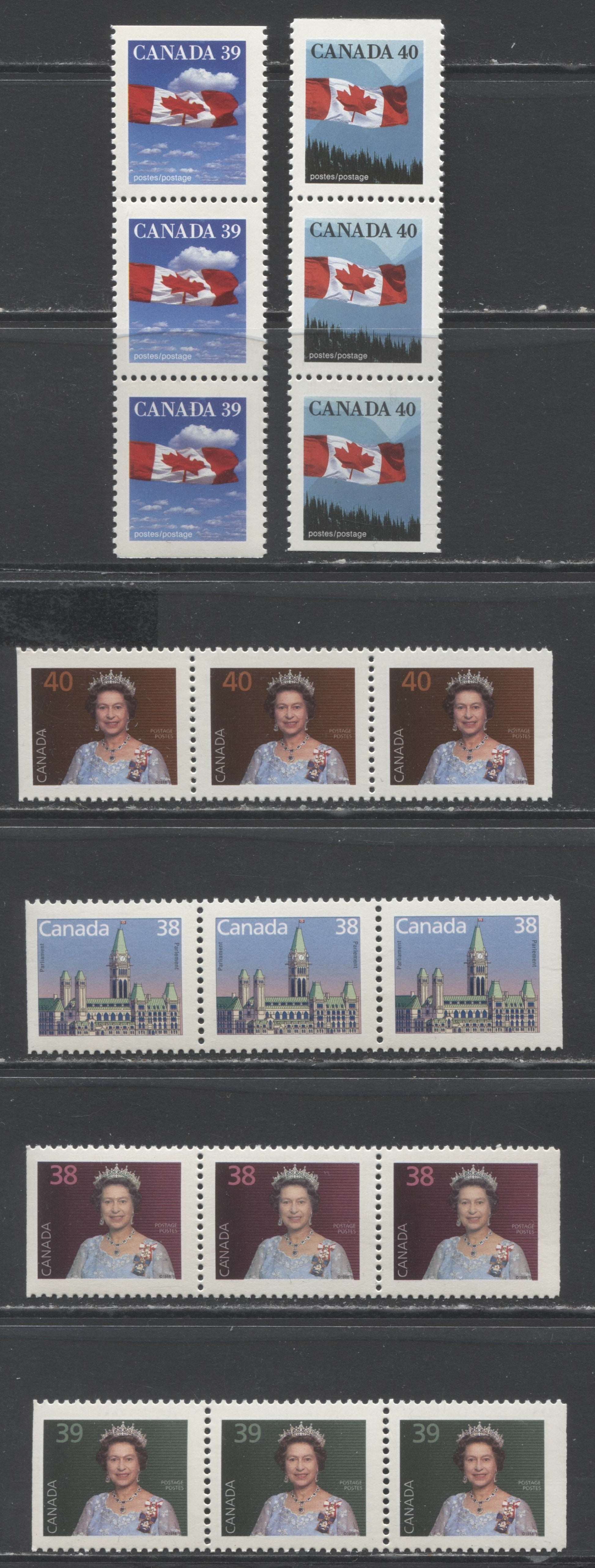 Lot 40 Canada #1164as, 1165as, 1166as-asi, 1167as-asi, 1168as-asi, 1169as 38c-40c Multicolored Flag Over Mountains & Queen Elizabeth II, 1988-1990 Domestic First Class Rate Issue, 6 VFNH Booklet Strips Of 3