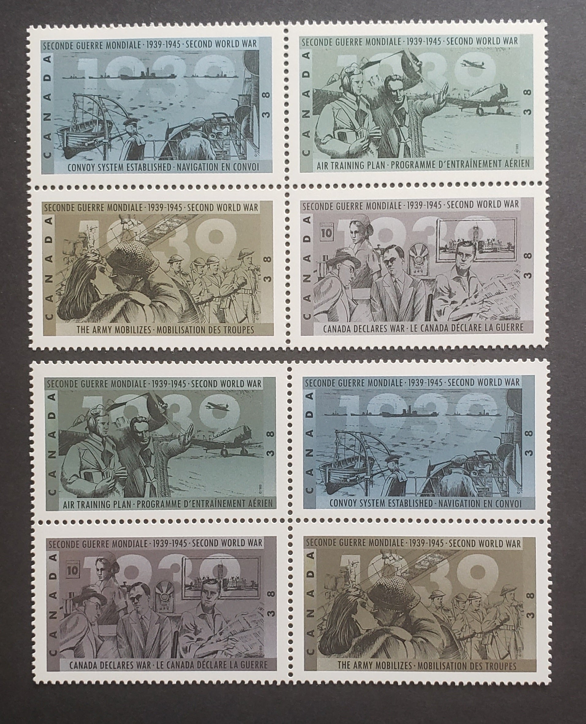 Lot 133 Canada #1283a, var 38c Multicoloured Various Wartime Scenes, 1989 50th Anniversary of World War II Issue, 2 VFNH Se-Tenant Blocks of 4 NF/DF and DF/LF Peterborough Paper