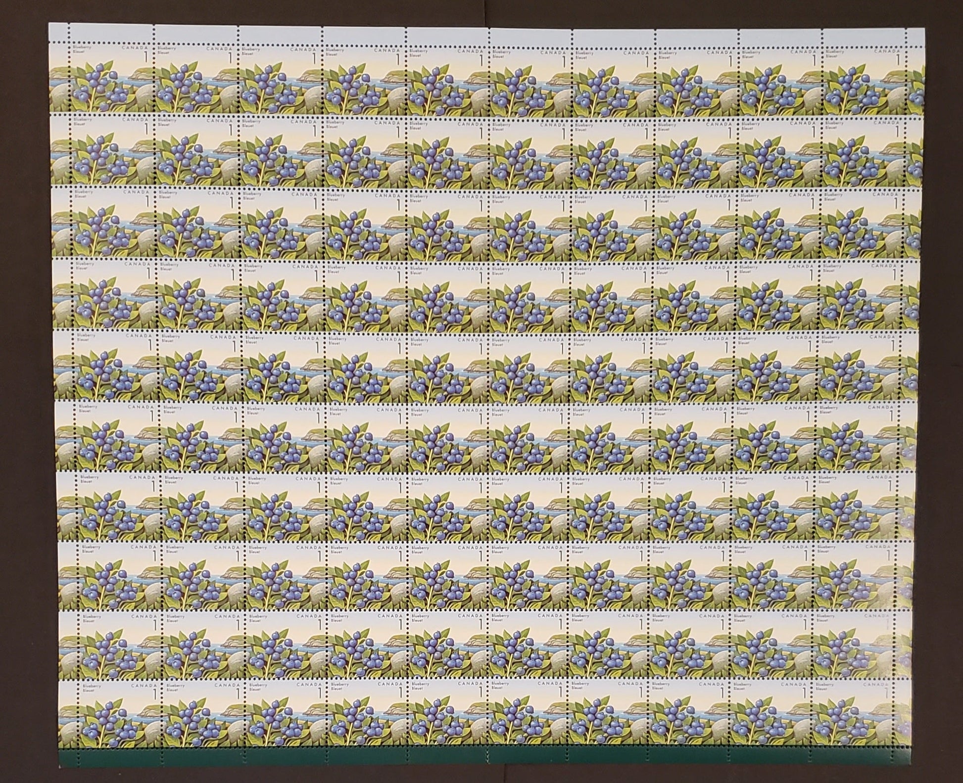 A VF-75 NH folded down middle field stock sheet stock sheet of 100 (10 x 10) of the multicoloured Blueberries from the 1992 Edible Berry Definitives. Printed on NF/DF Coated paper, with selvedge perforated through. CBN Printing. Unitrade cat as singles is $25. Without The Listed Varieties. The listed varieties being snake in grass & blue thread.