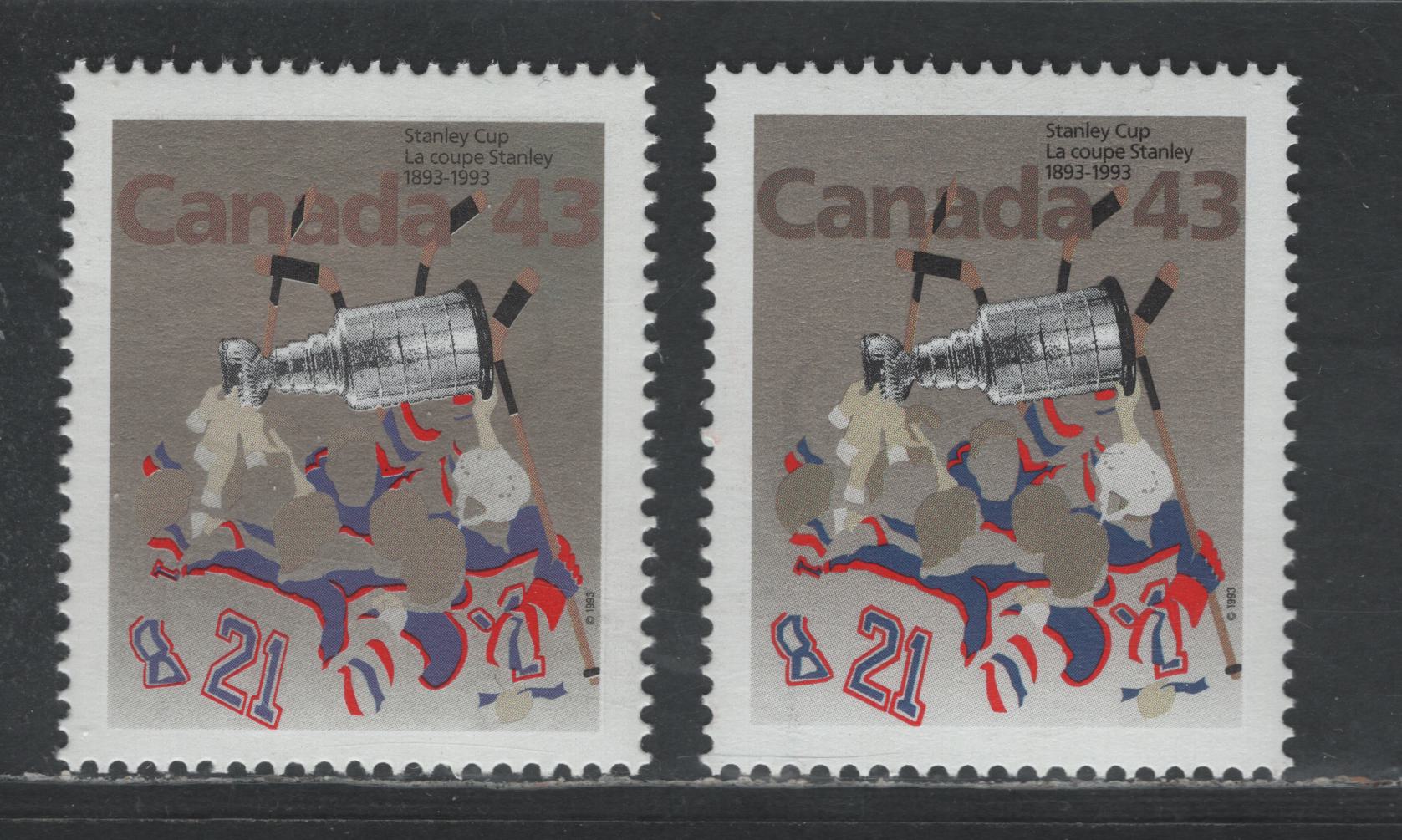 Canada #1460&var 43c Multicoloured Hockey Players & Stanley Cup , 1993 Stanley Cup Issue, 2 VFNH Singles With Pinkish Silver Background On The Scarcer NF/DF2 Coated Papers Paper, Deep Grey Brown & Brown Canada Inscriptions