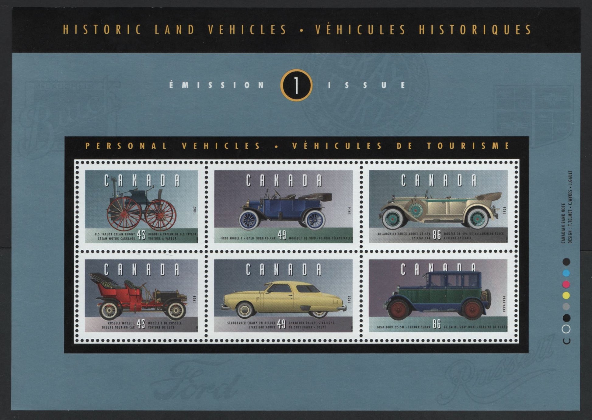 Canada #1490 43c-86c Multicoloured H.S. Taylor Steam Buggy - Gray-Dort Model 25-SM, 1993 Historic Land Vehicles Issue, A VF Used Souvenir Sheet On NF/DF2 Coated Papers Paper