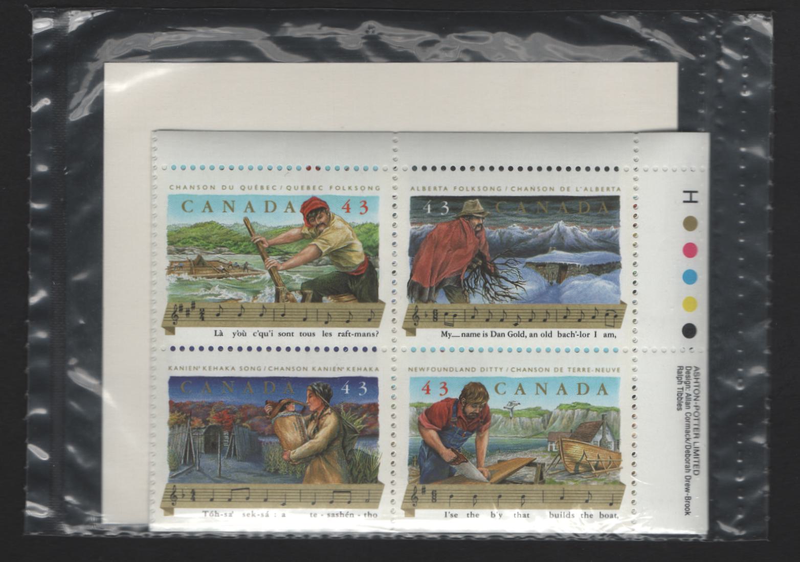 Canada #1494a 43c Multicoloured Alberta Folksong - Kanien' Kehaka Song, 1993 Canadian Folklore Issue, A VFNH Sealed Pack of Inscription Blocks Type 4 MF Blue & White Cardboard Insert, DF2 Harrison Paper