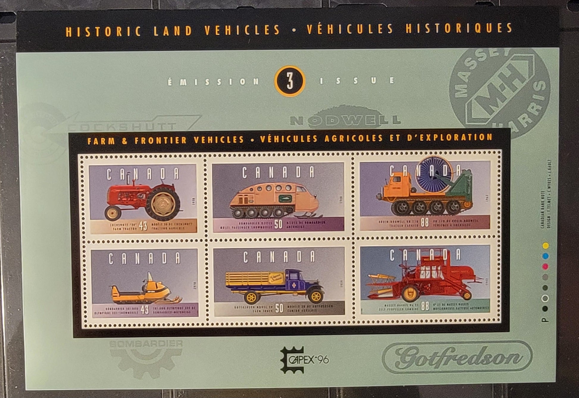 A VFNH souvenir sheet of the 43c-88c multicoloured Cockshutt "30" Tractor - Massey Harris #21 Combine from the 1995 Historic Land Vehicles Issue on MF Peterborough paper.