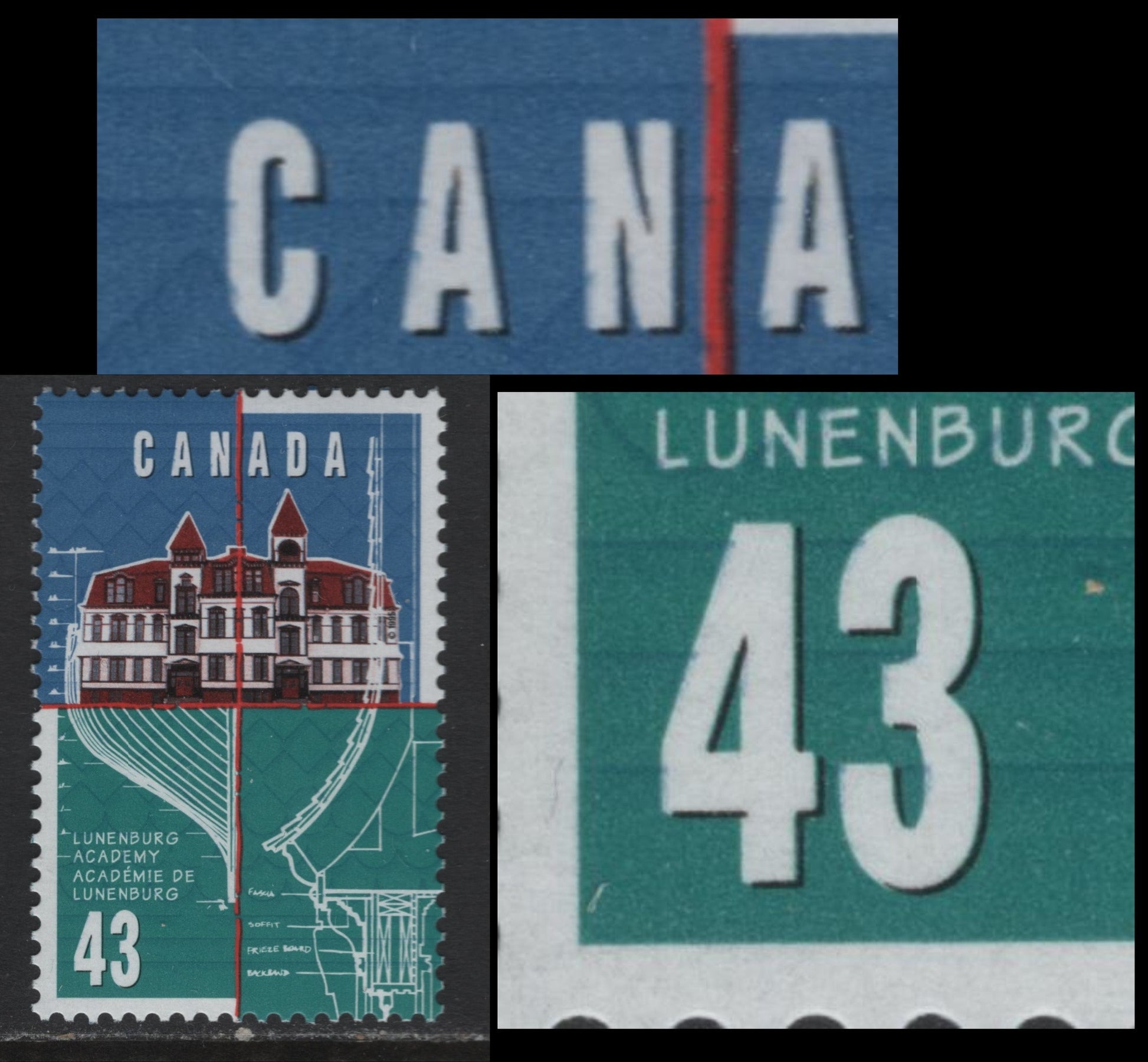 A VFNH single of the 43c multicoloured Lunenburg Academy from the 1995 Lunenburg Academy Centenary issue on MF Peterborough paper, minor shift of darker blue into "Canada" & "43".