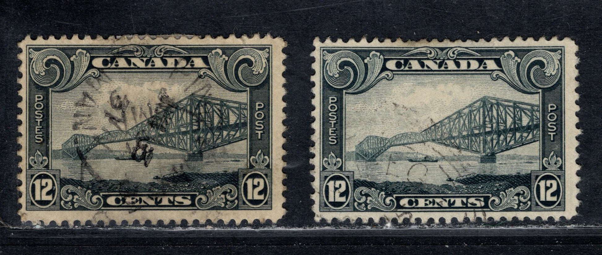Canada #156 12c Deep Slate Gray & Deep Slate Quebec Bridge, 1928-1929 Scroll Issue, 2 Fine Used Singles