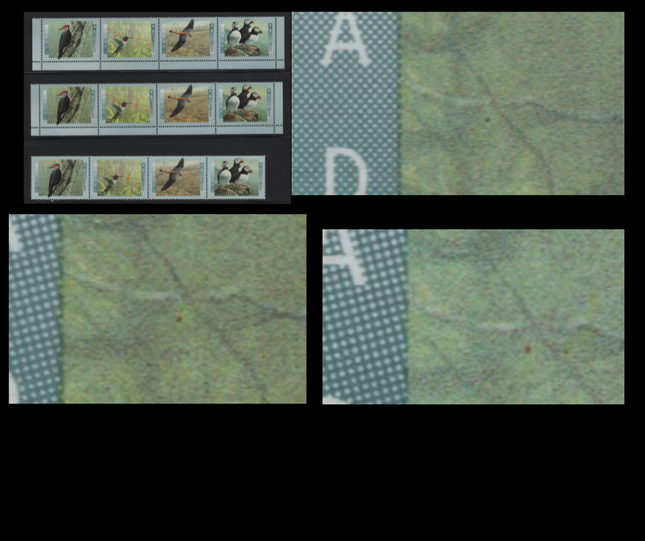3 VFNH se-tenant strips of 4 of the 45c multicoloured American Kestrel - Ruby-Throated Hummingbird from the 1996 Birds of Canada Issue on LF, unlisted F and MF Peterborough papers. All of the Pileated Woodpecker stamps show a "pine cone seed" variety just to the left of where the two branches at lower left cross. On some stamps, this seed is black, and on other stamps it is red.