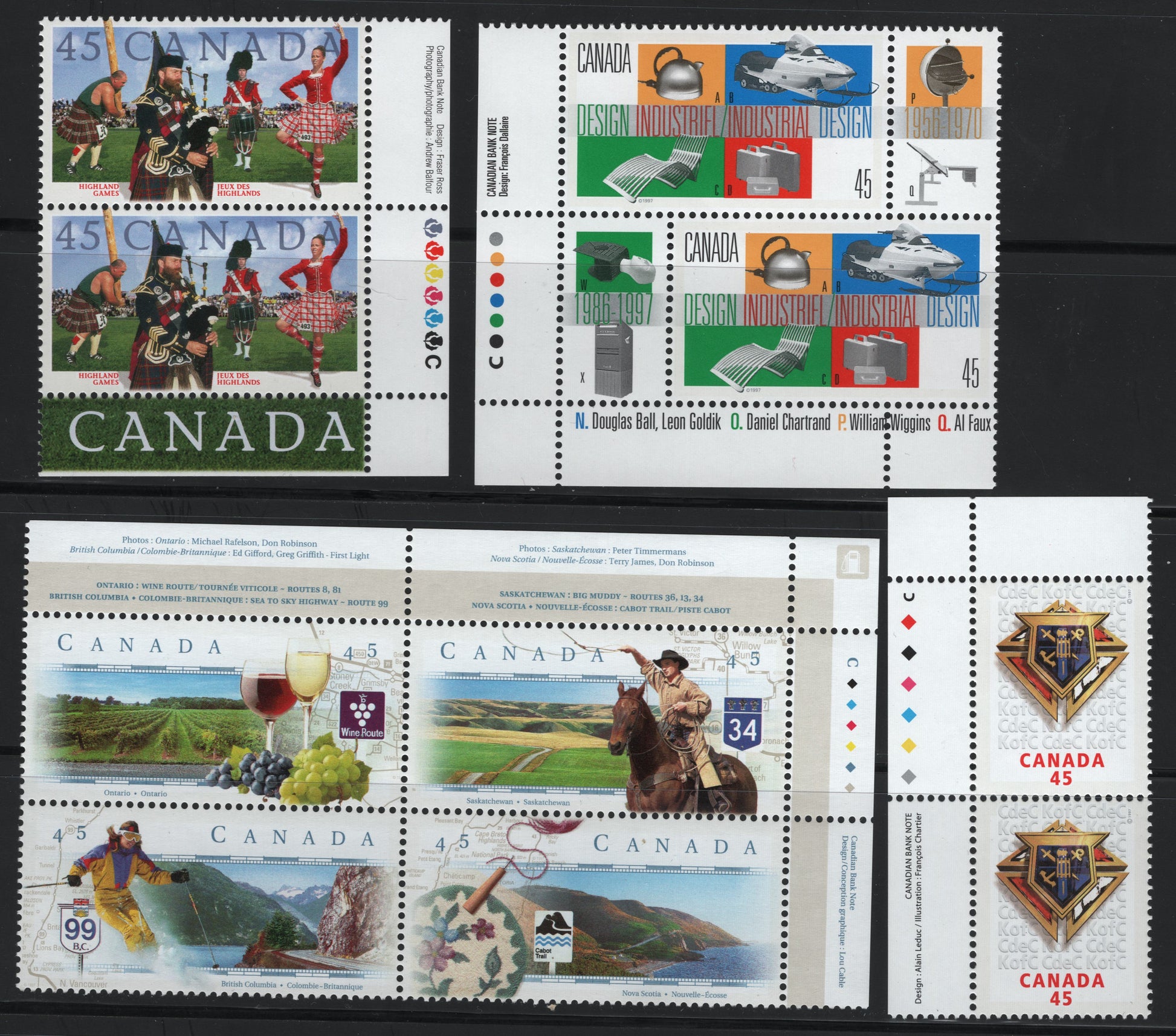 Canada #1653a-1656 45c Multicoloured Sea To Sky Highway - Knights Of Columbus Emblem, 1997 Scenic Highways - Knights Of Columbus Issues, 3 VFNH Inscription Pairs & Inscription Block