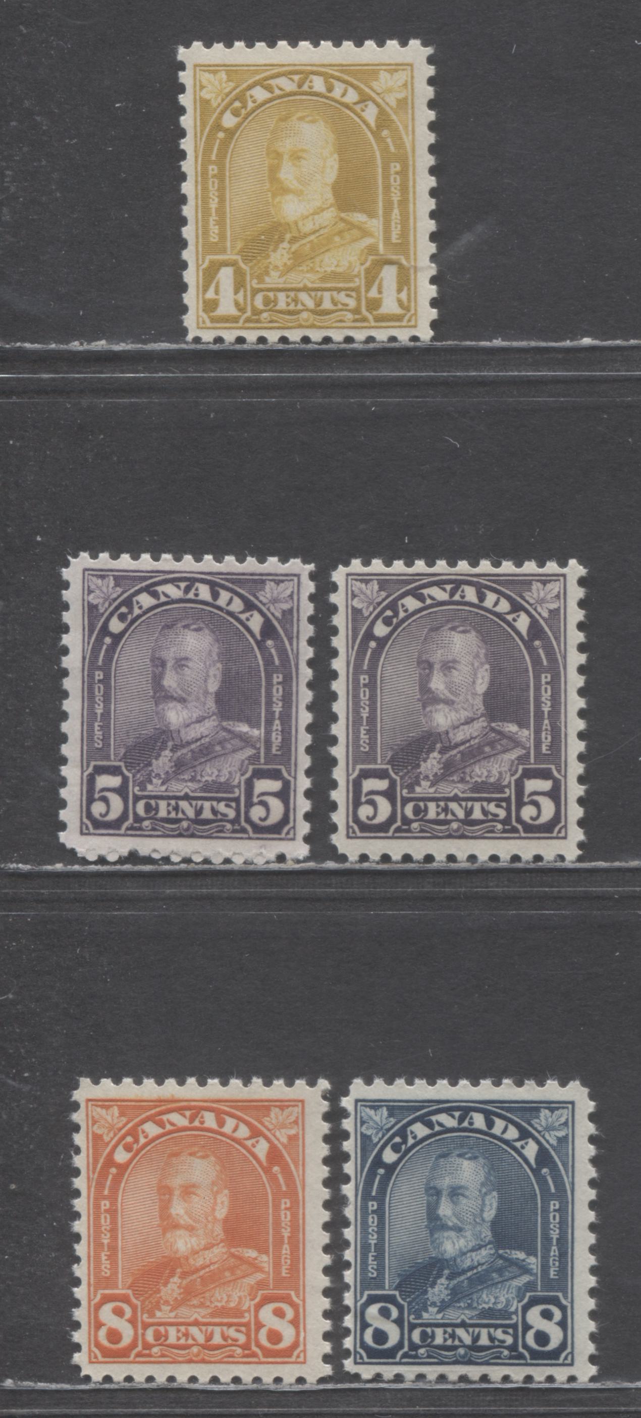 Lot 80 (C) Canada #168-169, 169a, 171-172 4c-8c Yellow Bistre - Red Orange King George V, 1930-1931 Arch/Leaf Issue, 5 FNH Singles Includes Both Flat & Rotary Press 5c Violet