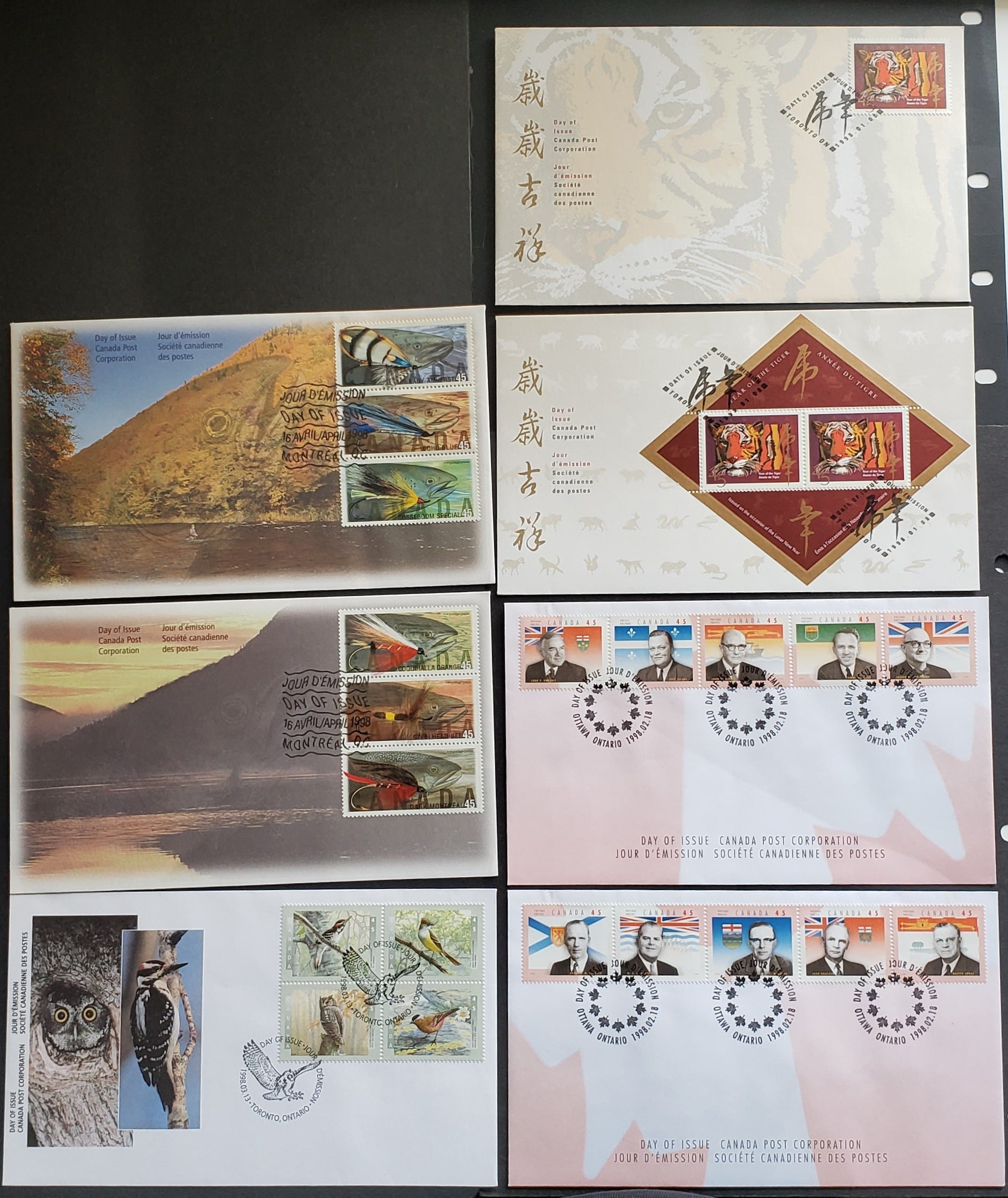 Canada #1708,a, 1709a-j, 1713a, 1715-1720 45c Multicolor 1998 Year Of The Tiger - Fishing Flies, 7 Canada Post FDC's Franked With Singles, Se-tenant & Souvenir Sheets, Approx 40,000 Issued Of Each, Cat. Value $25.2