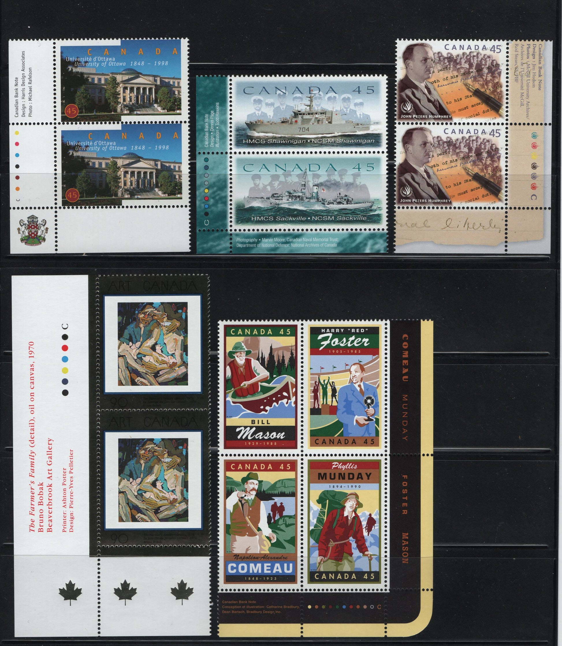 Canada #1753a-1754, 1756, 1761, 1763 45c Multicoloured Napoleon-Alexandre Comeau - HMSC Shawnigan, 1998 Legenday Canadians - Canadian Naval Reserve, 4 VFNH Inscription Pairs & Block