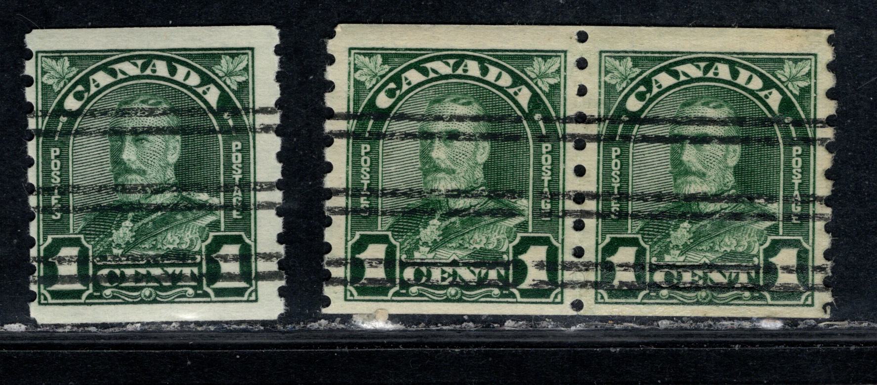 Canada #179xx 1c Deep Dull Green King George V, 1930-1931 Arch/Leaf Coil Issue, 2 F/VFNH Single & Pair With Striated & Non-Striated Gums