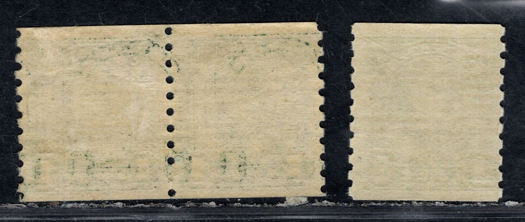 Aside from all this, there is also the largely unexplored issue of wet rotary versus dry rotary printings, and the possibility exists for the issuance of extremely rare rotary printings similar to those found on US issues of this period. In those cases the rarities result from the decision to perforate coil waste sheets and reissue them as sheet stamps. Canadian specialists historically have missed this connection between US and Canadian philately of this period, given that the Canadian post office leased Stickney rotary presses from the US Bureau of Engraving & Printing. But, it seems highly probable to me, after seeing the work done by Julian Goldberg and John Dell on this issue, that such rarities could exist on this issue. The normal stamps show both a design size difference in the design widths (dry printings are wider) and in the perforation, where the wet rotary printings are perf exactly 11, while the dry printings are perf. 11.25. Supposedly all the 1c, 2c and 3c values, except the booklet stamps are wet rotary printings. The real prize items to look for are dry rotary examples of these first few values. We know they exist on the Medallion issue, so there would appear to be at least a chance that they would exist on this issue also. Coil waste stamps, if they exist, will have the same design dimensions as the coils, but will be perforated on all four sides.