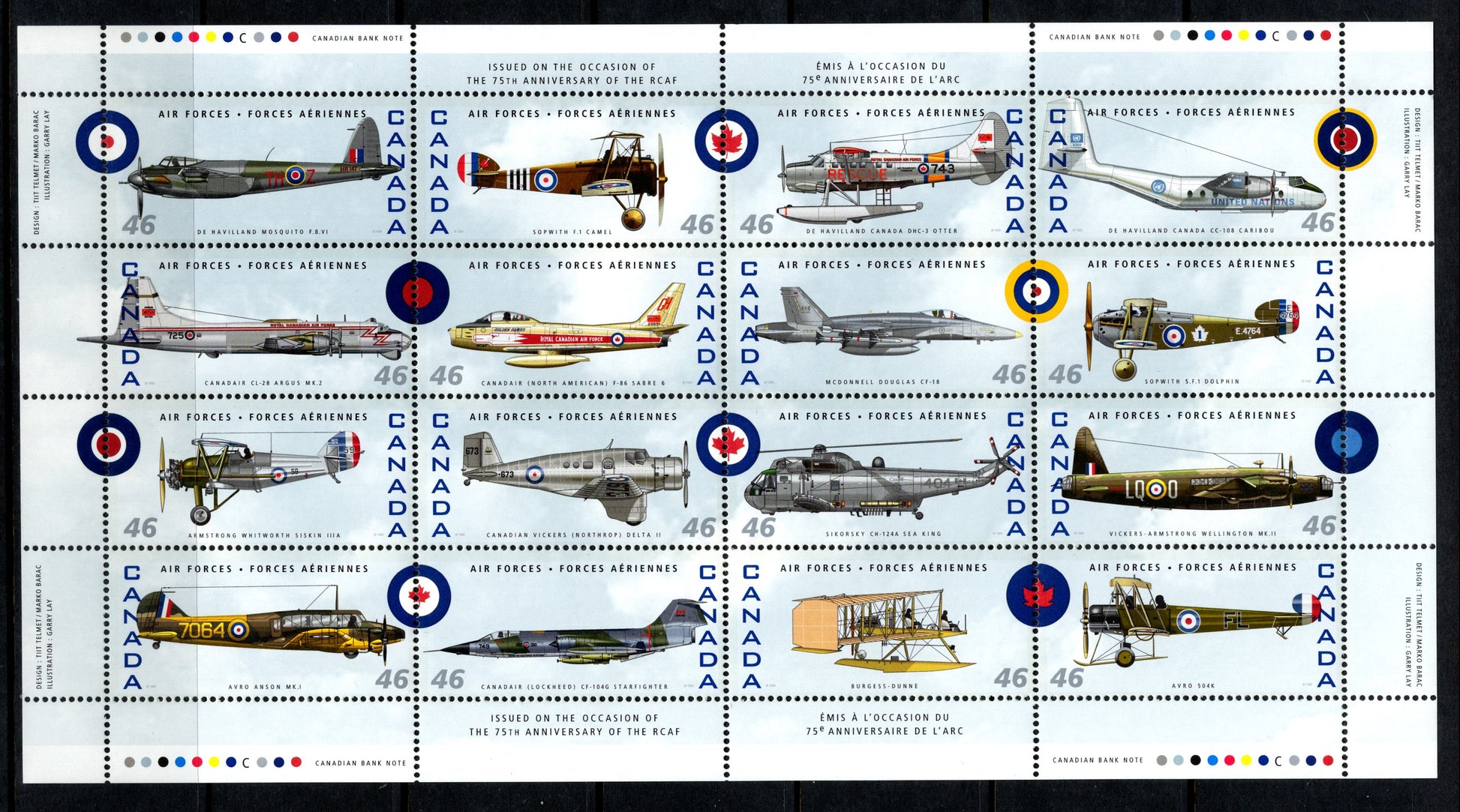 A VFNH full inscription sheet of 16 of the multicoloured De Havilland Mosquito FB VI - Avro 504K from the 1999 Canadian Air Forces Issue .