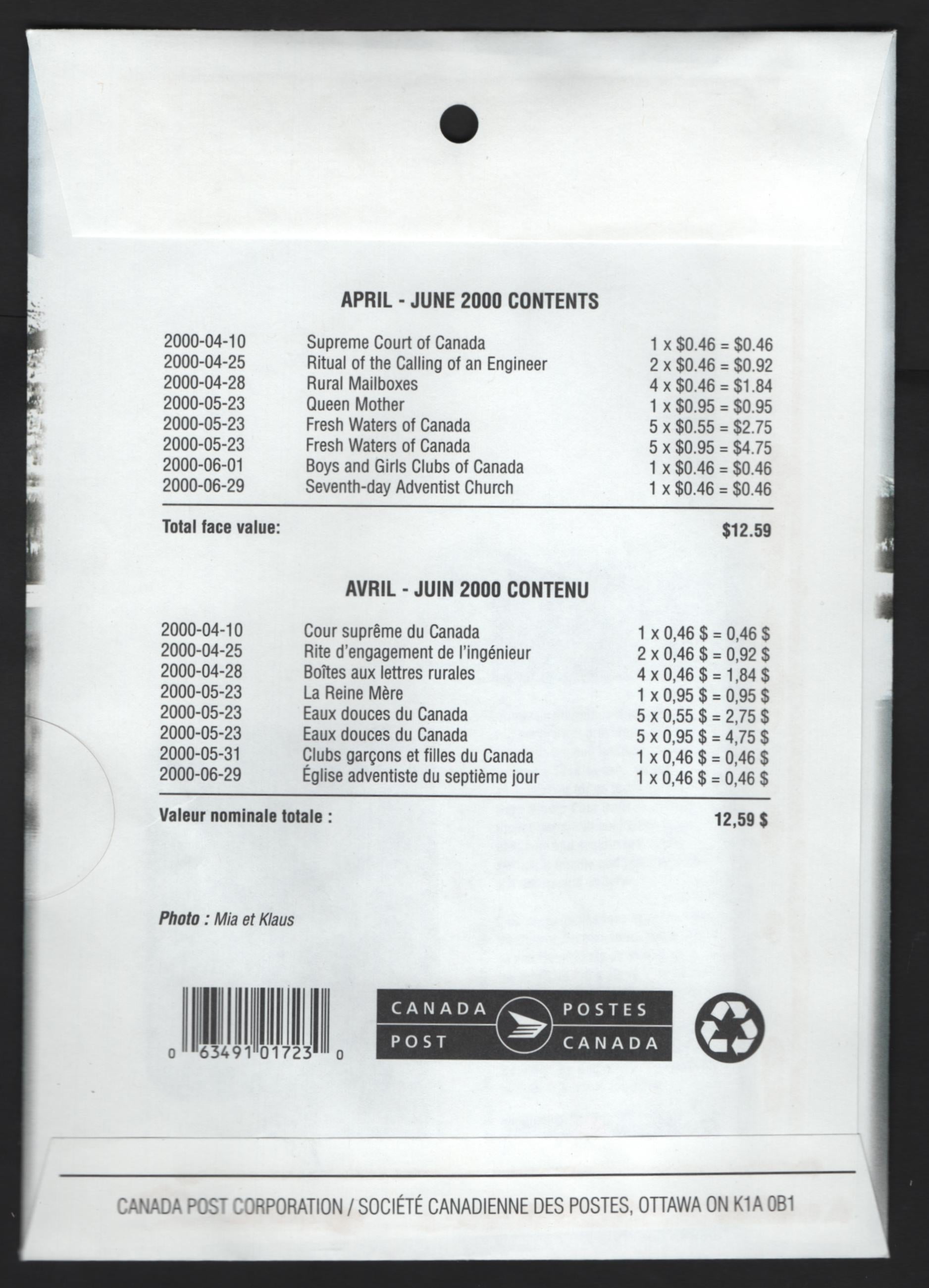 Lot 85 Canada #1847-1858 46c-95c Multicoloured Supreme Court Justices - Sun Breaking Through Clouds, 2000 Supreme Court Issue - Seventh Day Adventist Church Issues, A VFNH Sealed Quarterly Pack Containing All Issues From April-June 2000