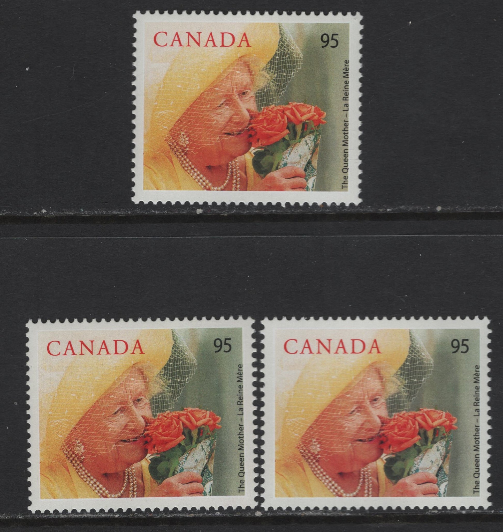 Canada #1856-1856i 95c Multicoloured The Queen Mother, 2000 A Royal Centenarian Issue, 3 VFNH Singles On Fluorescent, DF And Scarce Unlisted MF Backed TRC Papers