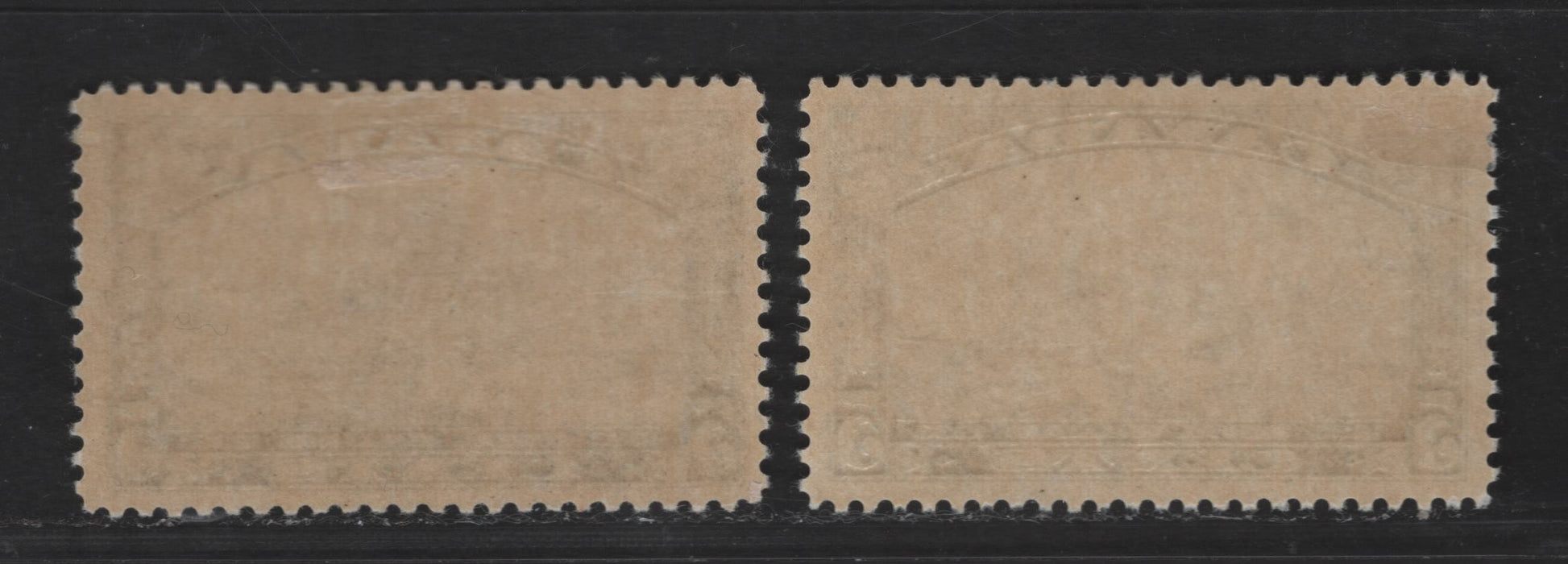 This issue shows some variation in shade, with the most common being shades of deep blue and deep dull blue. We have encountered one used example printed in a shade of bright blue. Unitrade does not list any varieties, but we have discovered some, including a tiny vertical dash in the second "3" of 1833. There is a bird in the sky variety under the first "A" of Canada. There is also a small horizontal dash inside the second A of Canada. Finally, we have found an example having a dot in the "C" of "Canada, and a small arc in the second A of Canada. Many of these may be constant, and we have discovered both mint and used examples of the dash in A of Canada, which proves that the variety is indeed constant. The gum shows the same variations as on the UPU conference issue. I have not, as yet, found any re-entries on this issue.