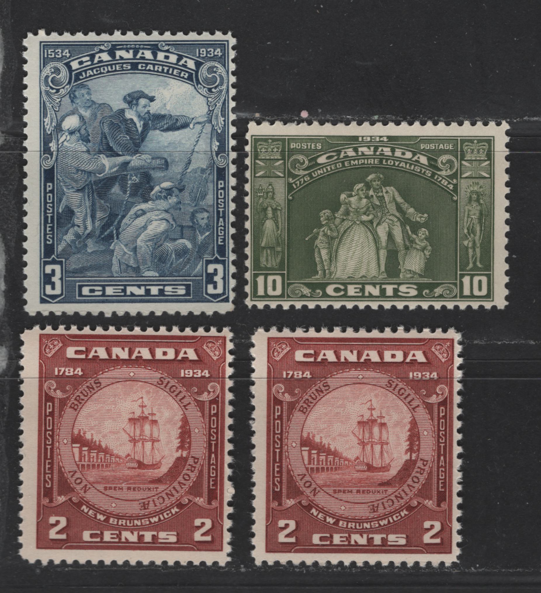 4 fine NH singles of the 2c-10c red brown - olive green Jacques Cartier - NB Seal from the 1934 400th Anniversary of Discovery Of Canada - 150th Anniversary Of Founding Of NB Issues including the closed frameline variety on NB issue.