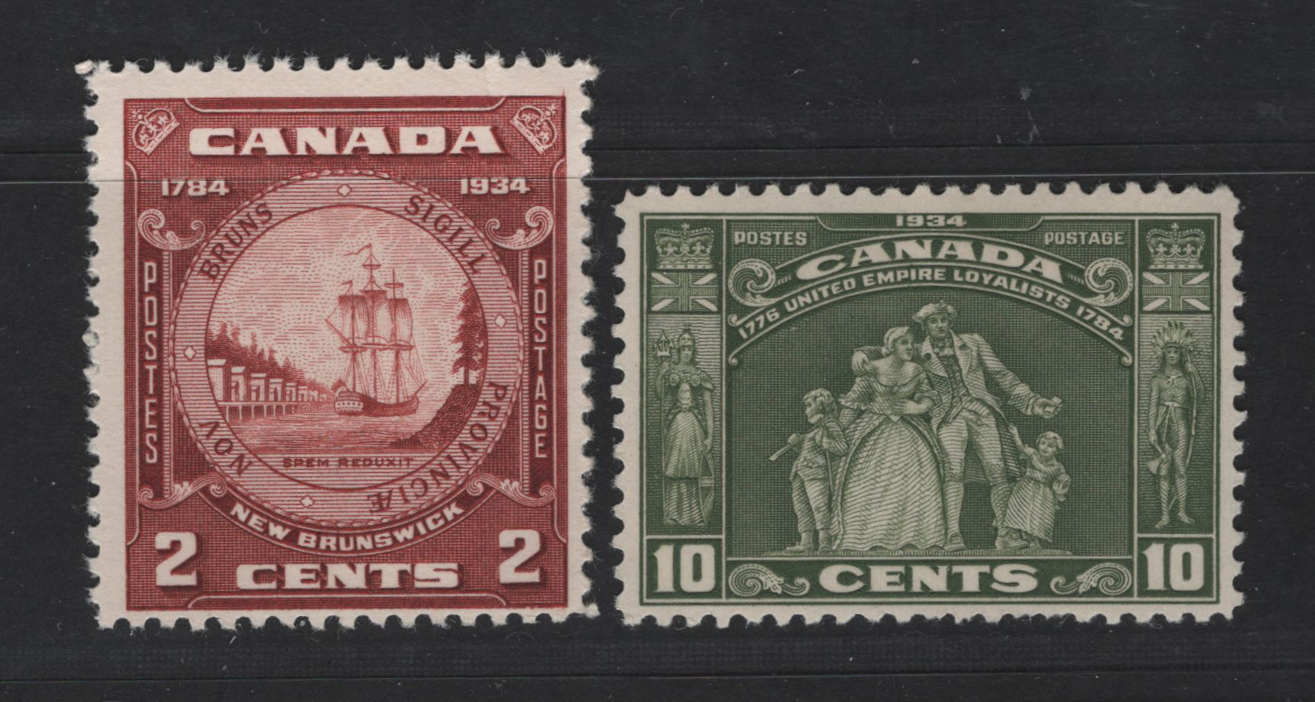 2 fine OG singles of the 2c, 10c red brown & olive green Loyalists Statue & NB Seal from the 1934 United Empire Loyalists & 150th Anniversary Of Founding Of New Brunswick Issues .