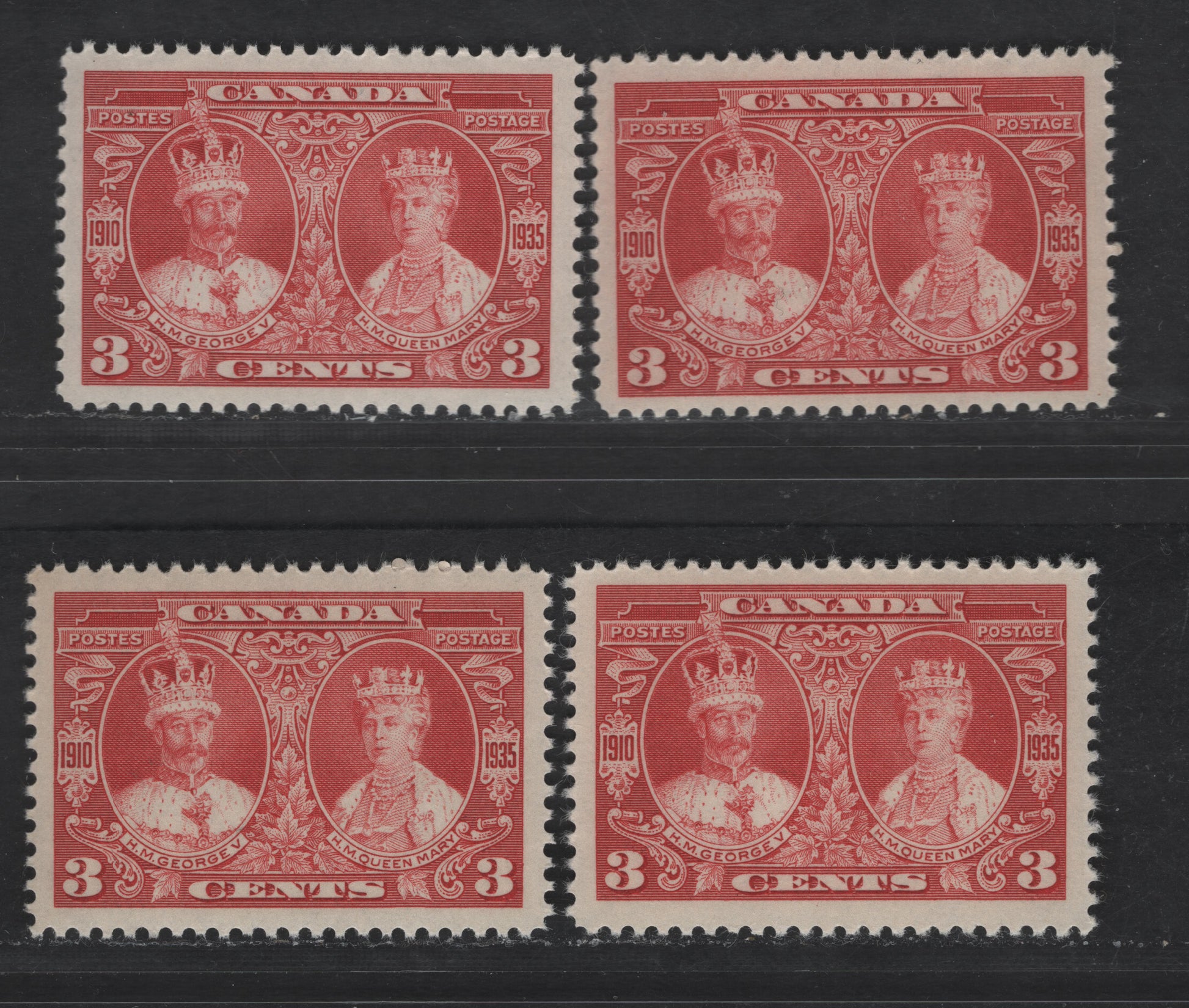 Lot 173 Canada #213 3c Carmine, Carmine Red & Deep Carmine Red King George V & Queen Mary, 1935 Silver Jubilee Issue, 4 VFNH Singles Different Paper & Gum Types - See Description For Details