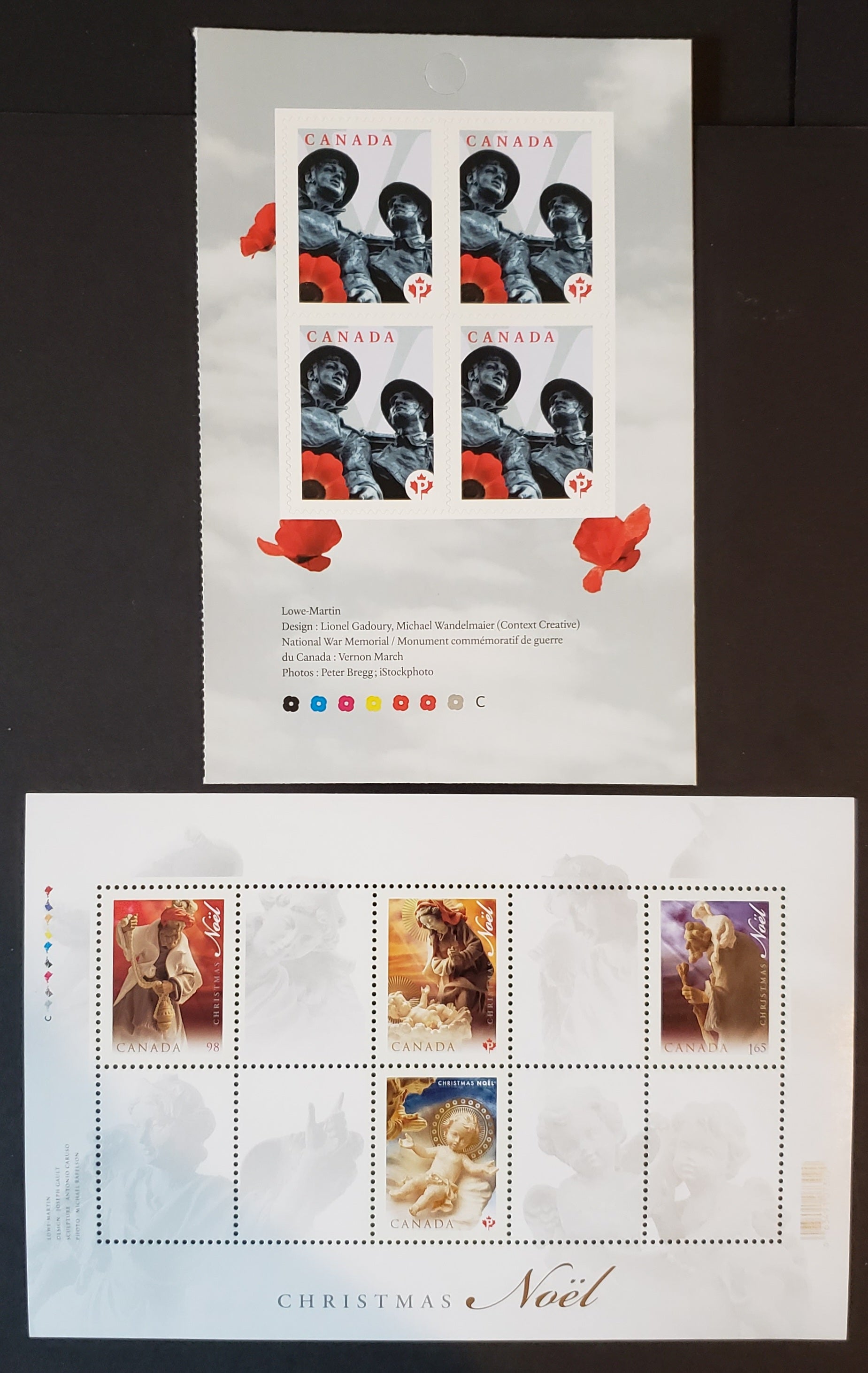 2 VFNH booklet pane & souvenir sheet of 4 of the p(54c) multicolored National War Memorial - Nativity Scene from the 2009 Rememberance Day & Christmas Issues.