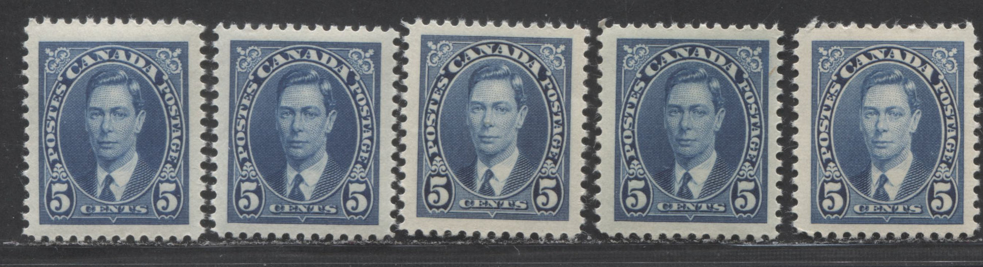 Lot 71 Canada #235 5c Blue, 1937 Mufti Issue, 5 VFNH Singles With Various Papers, Shades & Gums, Different From Previous (#106) Lot
