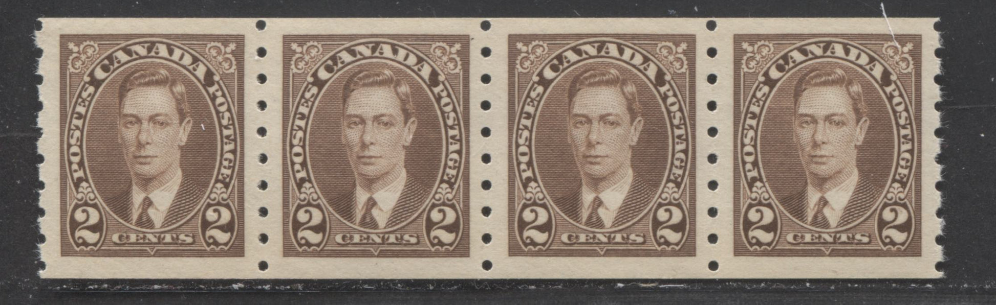 Lot 77 Canada #239 2c Brown King George VI, 1937 King George VI Coil Stamp Issue, A VFNH Strip Of 4 On Horizontal Wove Paper With Satin Sheen Cream Gum $45
