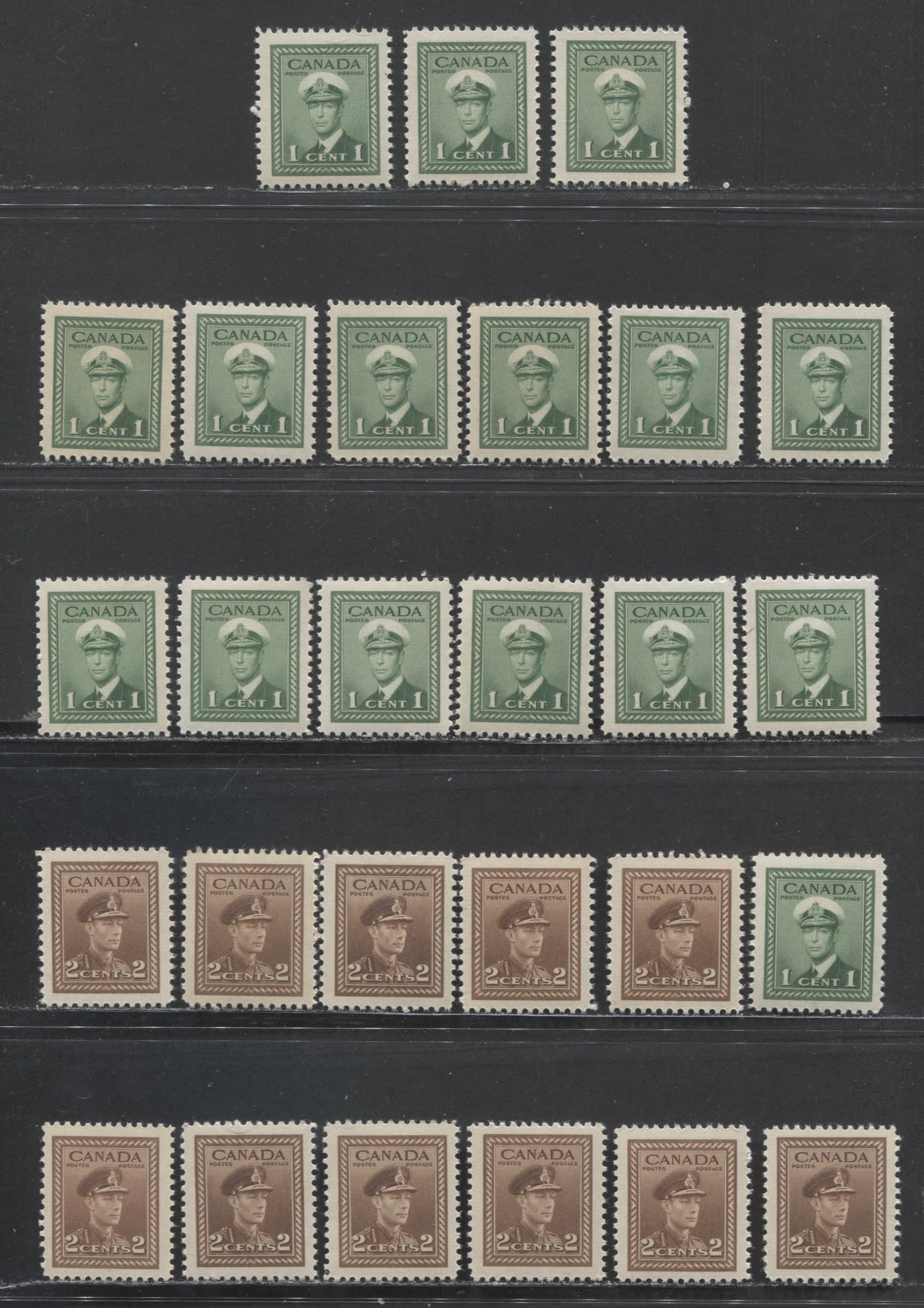 Lot 371 Canada #249-250 1c,2c Green, Brown King George VI, 1942-1943 King George VI - War Issue, 27 VFNH Singles Showing Various Shades, Paper And Gums