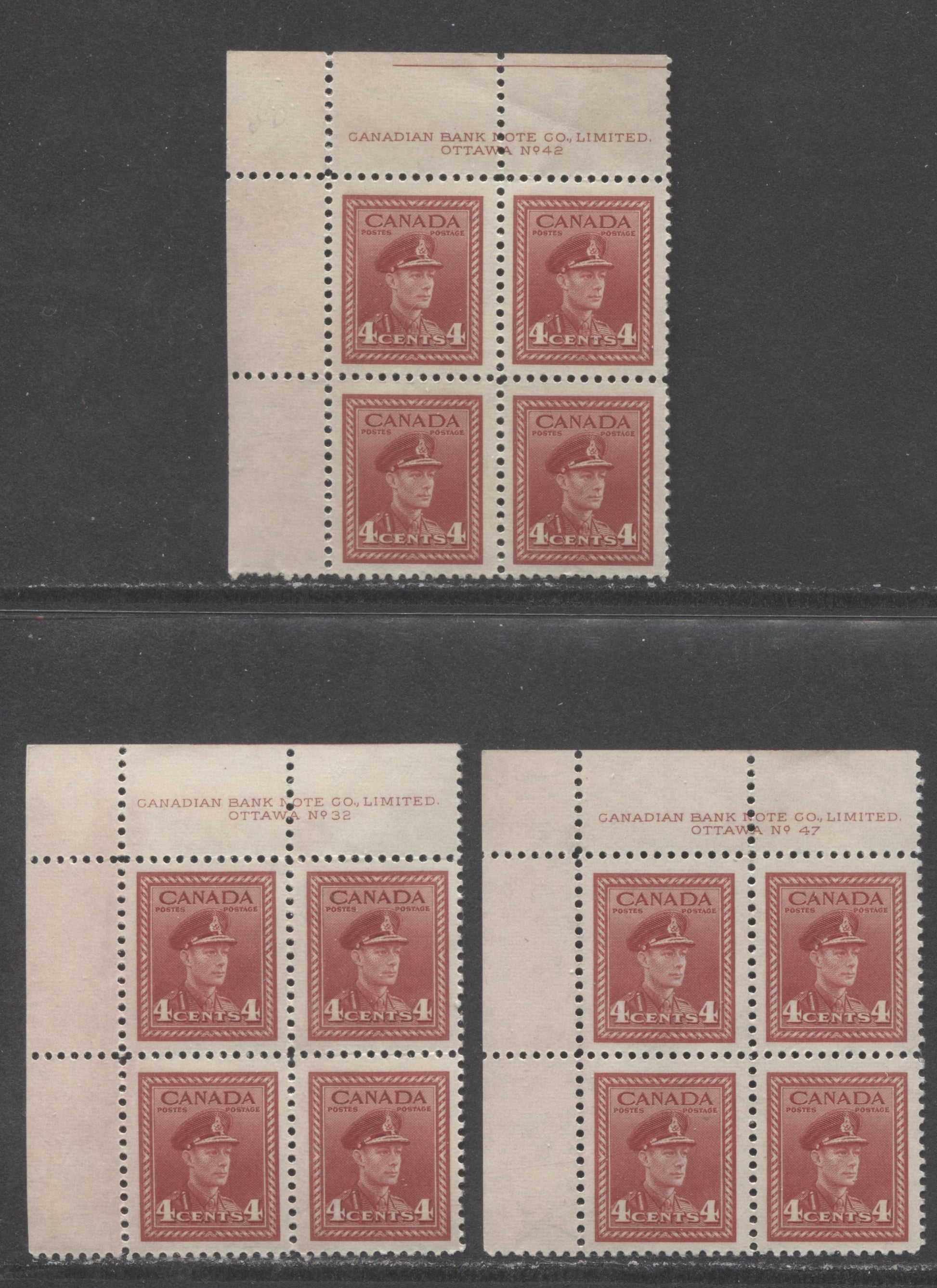 Canada #254 4c Dark Carmine King George VI, 1942-1943 War Issue, 3 VFNH UL Plate 32, 42, 47 Blocks Of 4