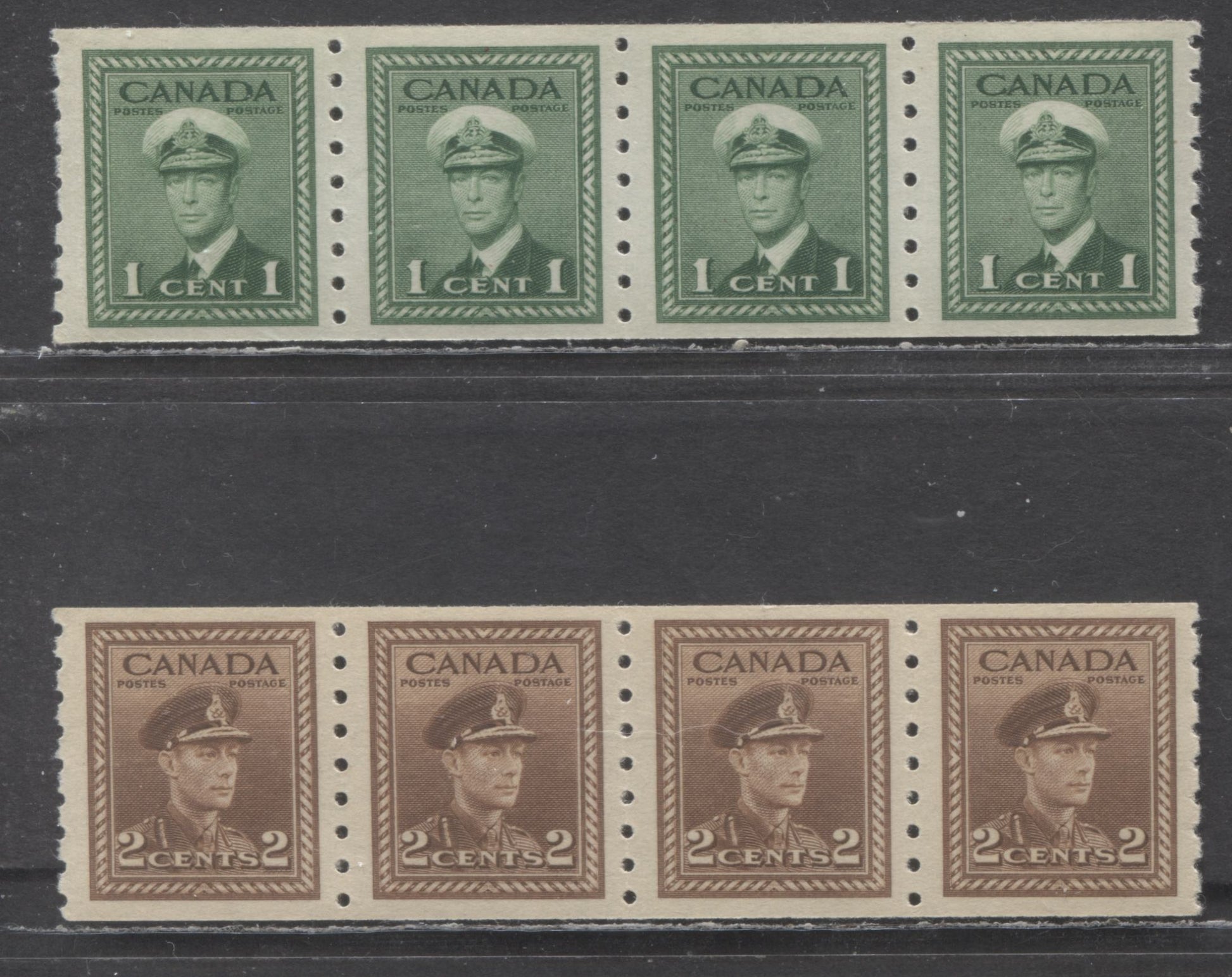 Lot 121 Canada #263-264 1c,2c Green, Brown, 1942-1943 King George VI War - Coil Stamps Issue, 2 VFNH Short Coil Strips Of 4 On Vertical Ribbed Paper With Semi Gloss Gum