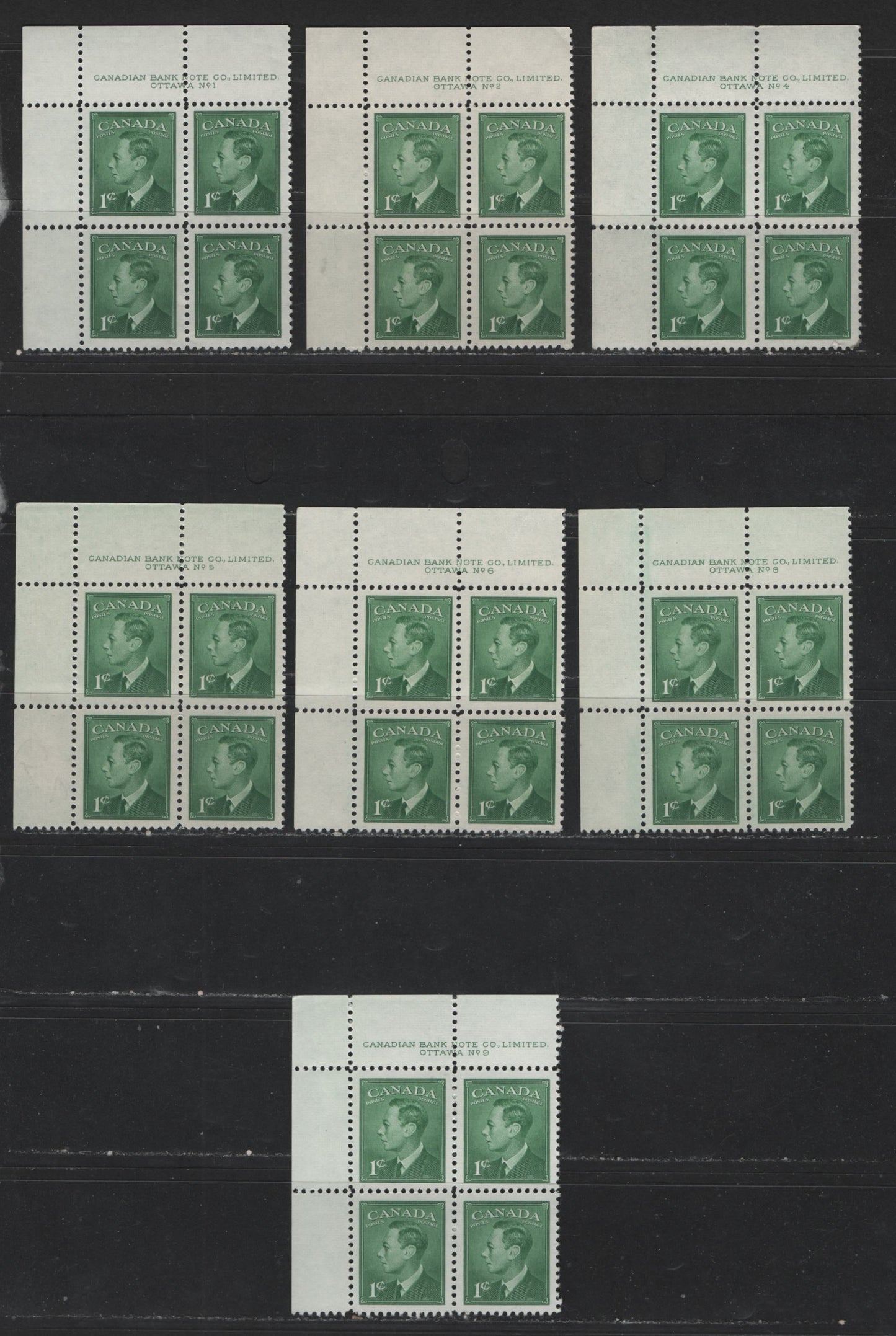 Lot 117 Canada #284 1c Green King George VI, 1949-1952 Postes-Postage Issue, 7 VFNH UL Plate Blocks Plates 1-2, 4-6, 8-9