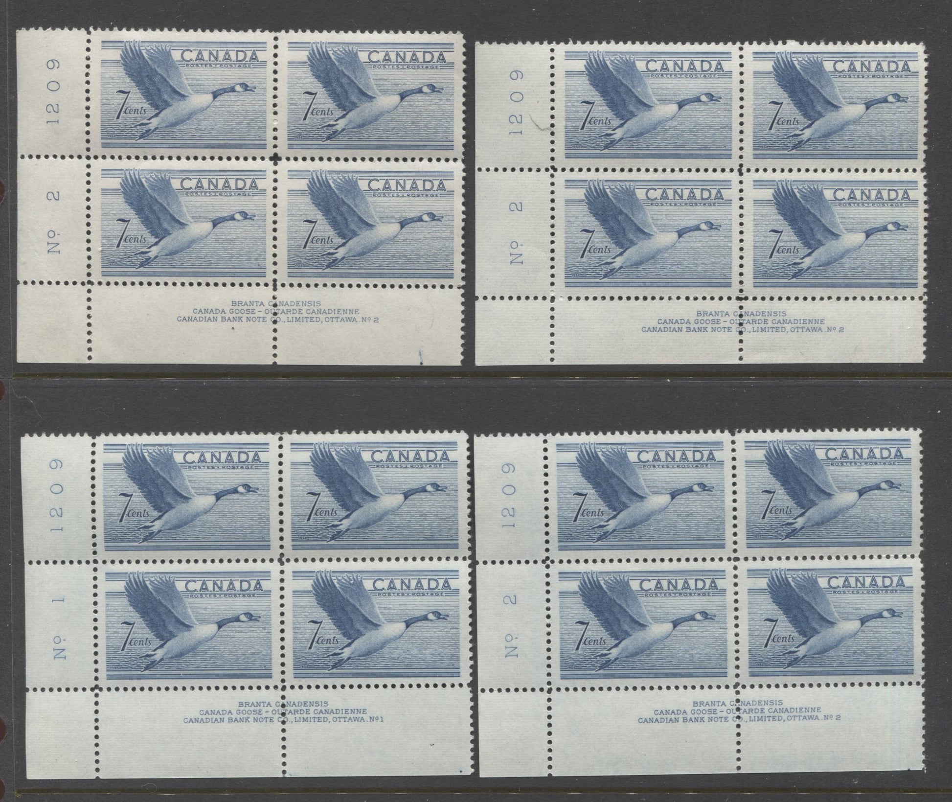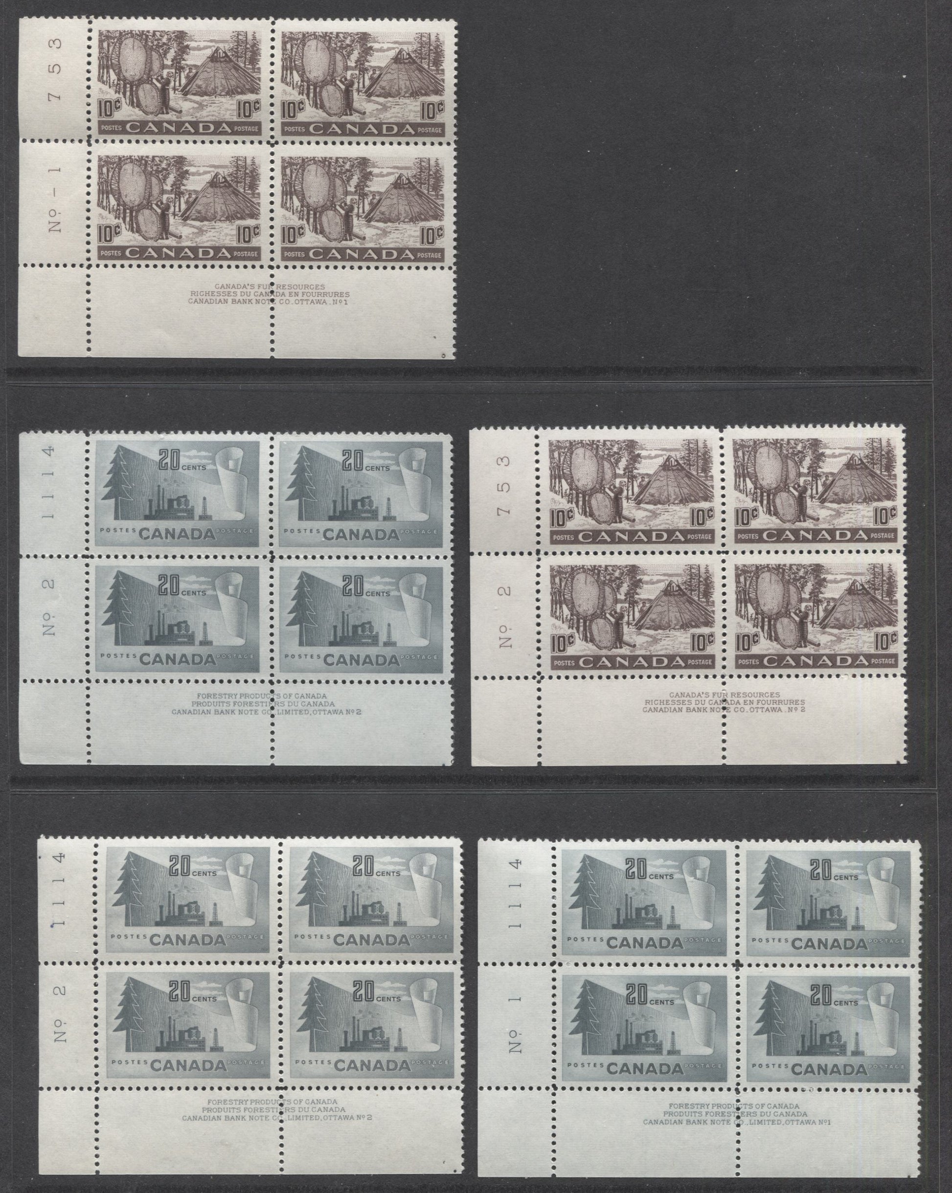 Lot 383 Canada #301, 316, 320 7c, 10c & 20c Blue, Black Brown & Gray Canada Goose, Drying Skins & Paper Mill, 1950-1952 Natural Resources & Wildlife Issue, 9 F/VFNH/LH LL Plates 1-2 Blocks Of 4 With Different Papers & Varieties