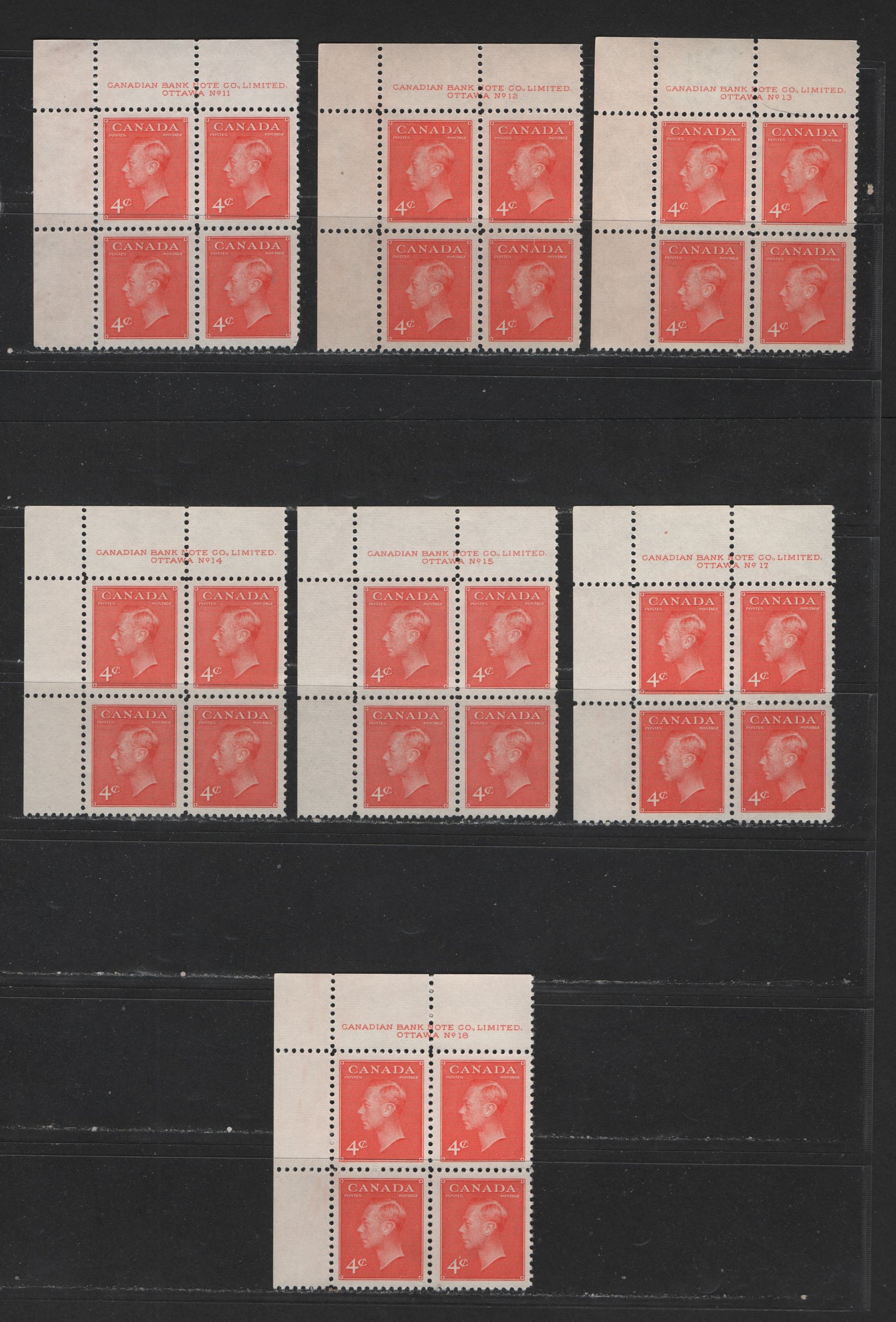 Lot 129 (C) Canada #306 4c Vermilion King George VI, 1949-1952 Postes-Postage Issue, 7 VFNH UL Plate Blocks Plates 11-18