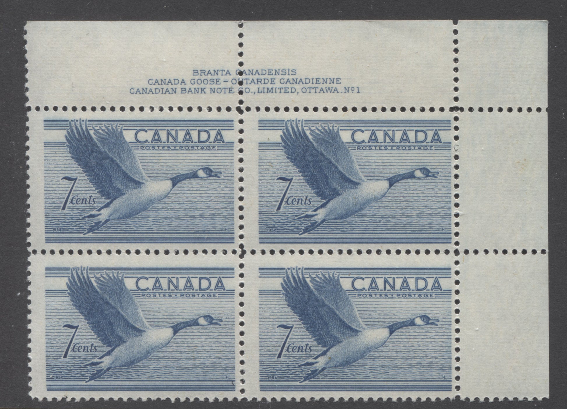Lot 21 Canada #316var 7c Blue Canada Goose, 1952 Wildlife Issue, A VFNH UR Plate 1 Block Of 4 With Hairlines In Top Margin, Unlisted In Unitrade